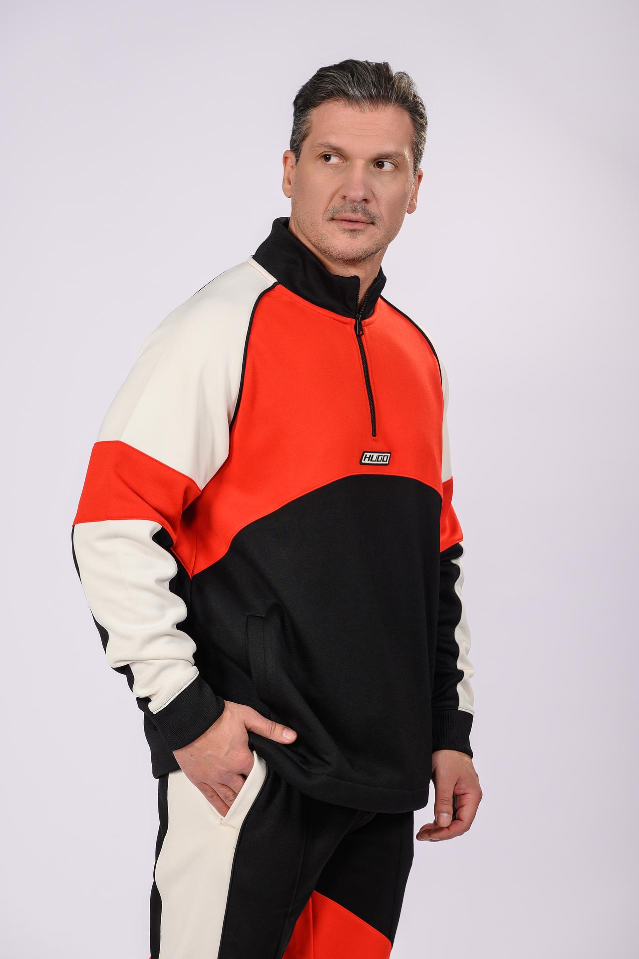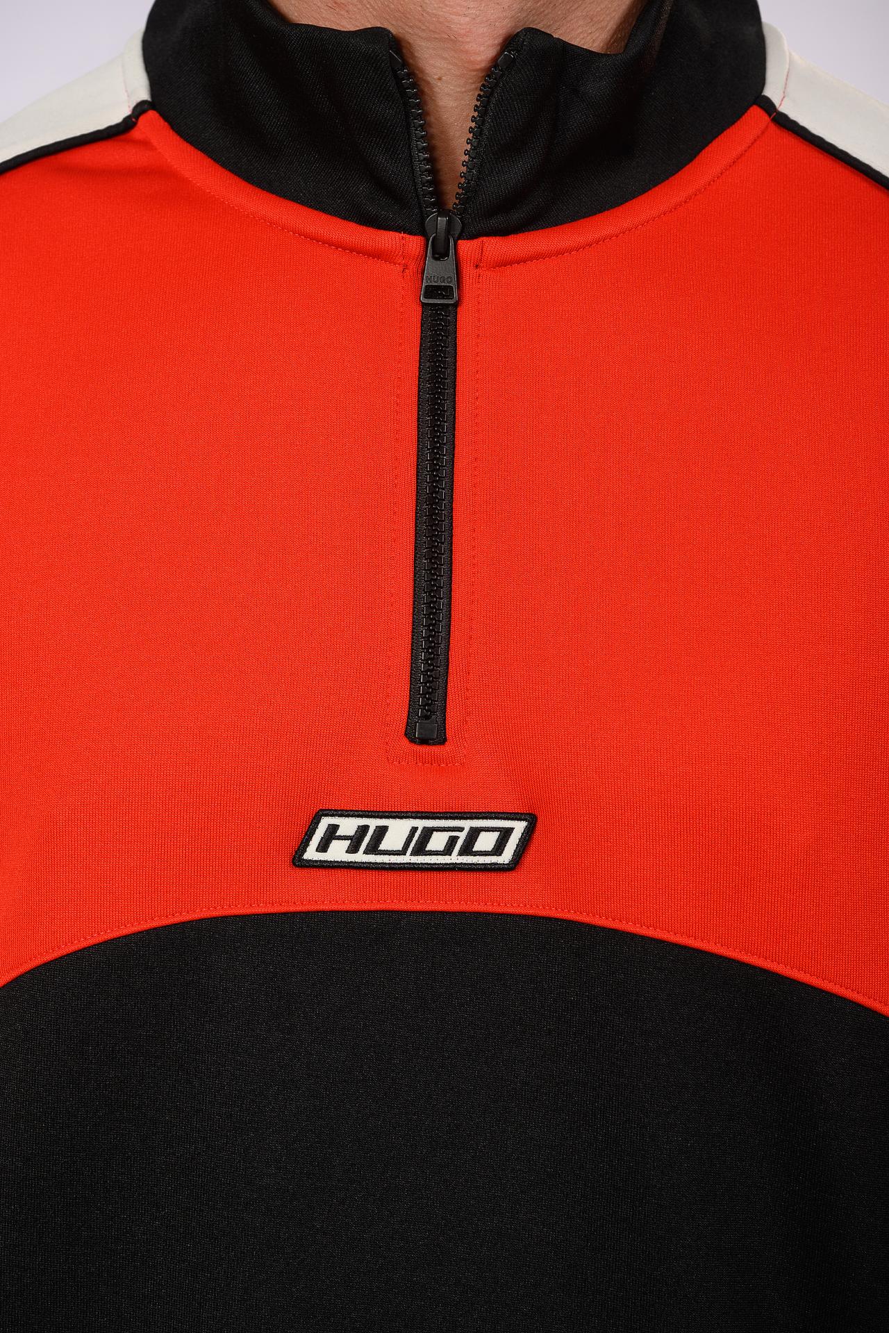 Стильный мужской пуловер от Hugo — идеальный выбор для создания современного спортивного образа. Модель выполнена в контрастной цветовой гамме, сочетающей черный, красный и кремовый оттенки, что придает ей динамичности и привлекательности. Пуловер декорирован фирменным логотипом Hugo, расположенным на груди, и оснащен удобной застежкой-молнией на воротнике.