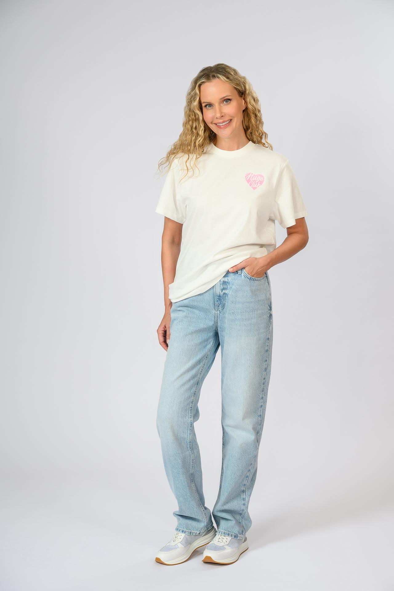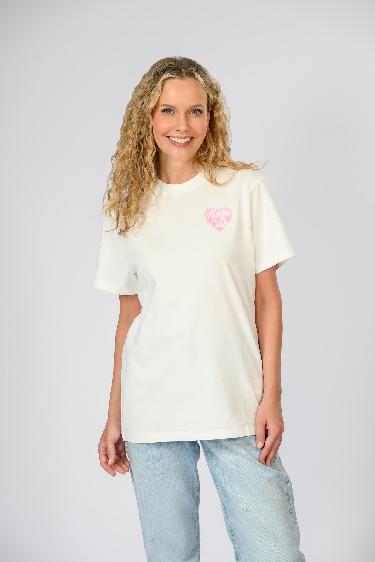 Классический крой и универсальный белый цвет позволяют сочетать ее с любыми элементами одежды, создавая разнообразные образы. Изюминкой данной модели является милый принт в виде сердца, который придает образу нежности и романтичности.
