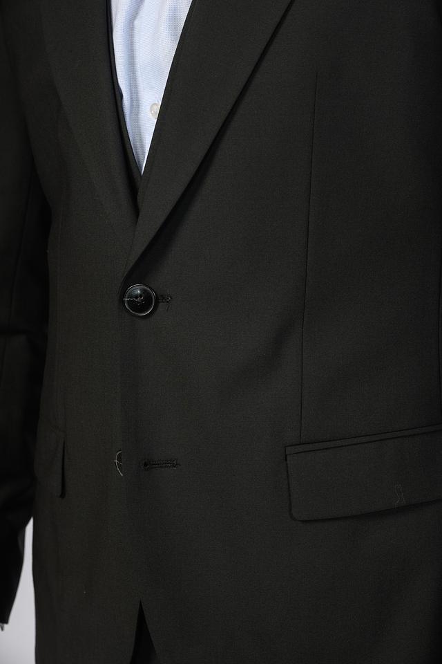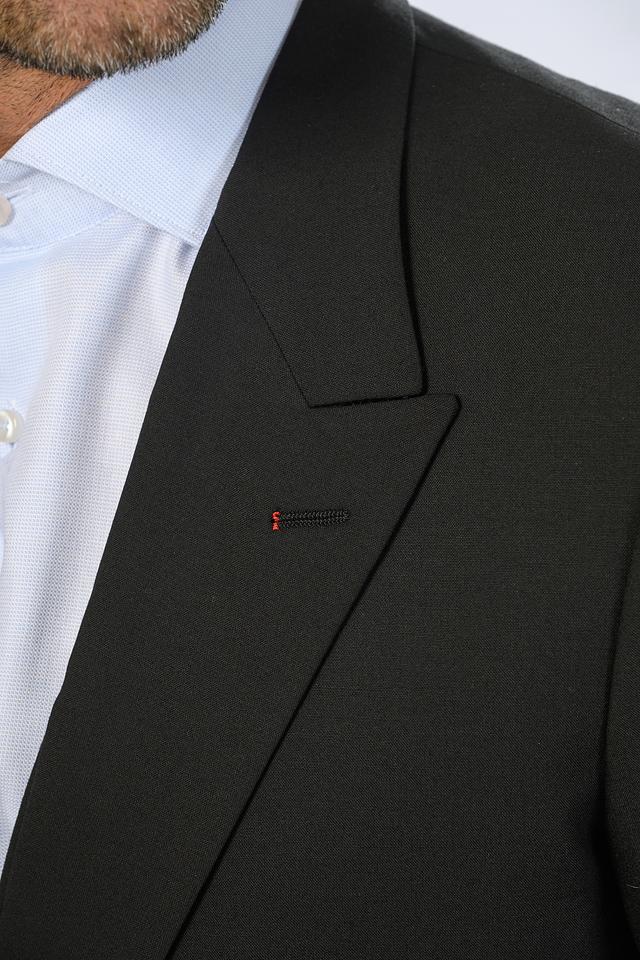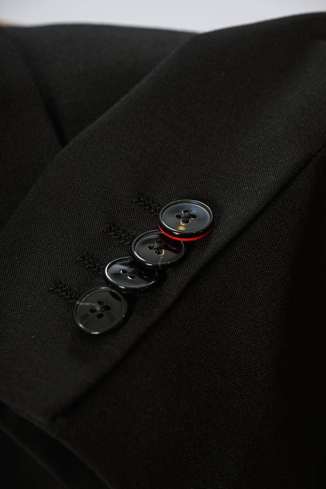 Костюм состоит из пиджака и брюк классического кроя. Пиджак застегивается на две пуговицы, имеет стандартные лацканы и функциональные карманы. Брюки имеют классический крой и стандартную посадку. На левом лацкане пиджака размещена небольшая фирменная деталь бренда.