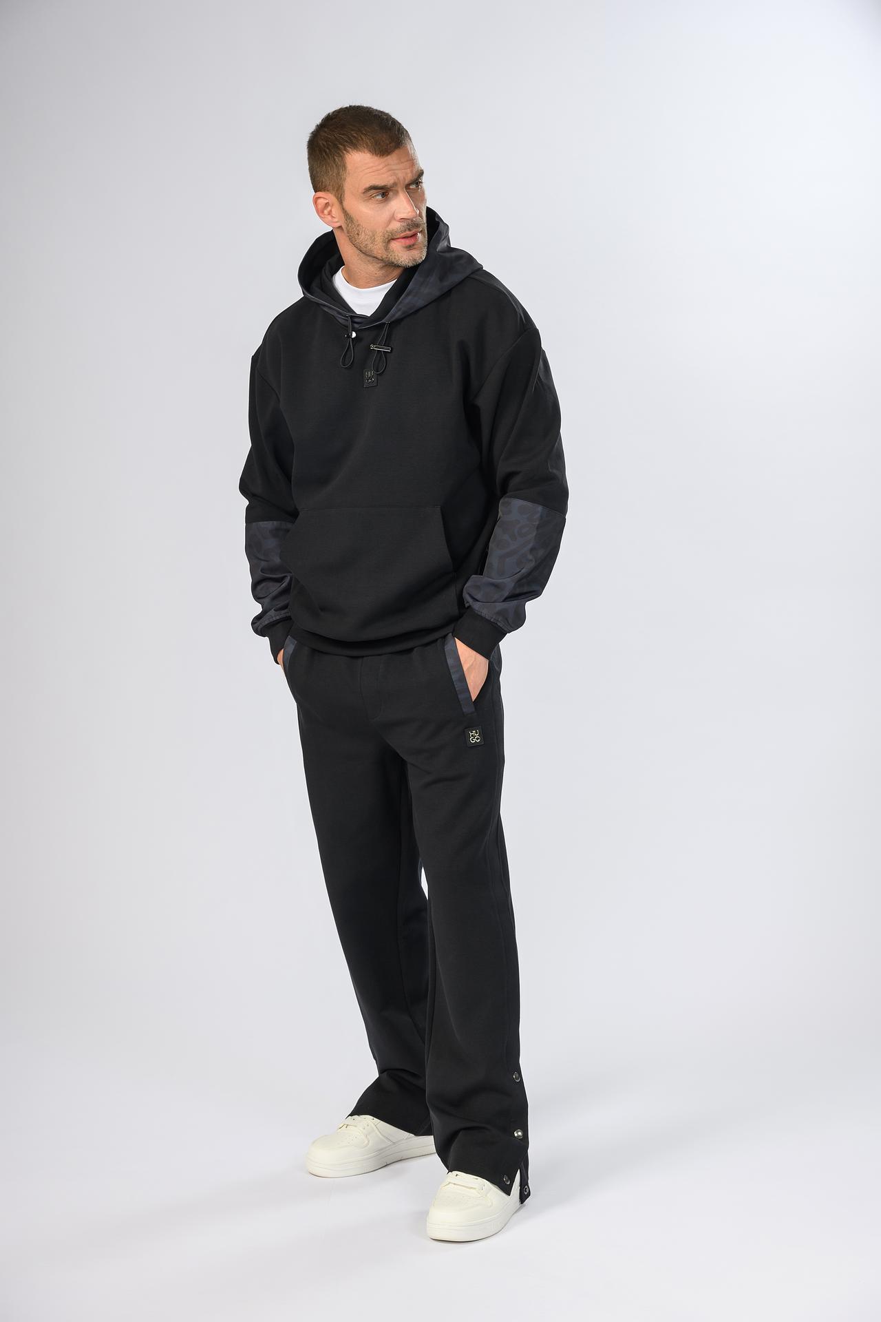 - Дизайн: Классический крой толстовки с капюшоном дополнена оригинальными вставками на рукавах с принтом, придающими модели изюминку. Практичный карман-кенгуру добавляет функциональности.