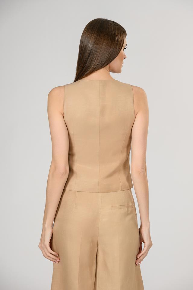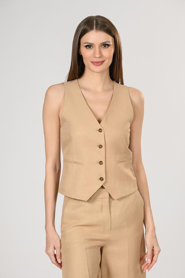 Бежевый жилет от i Blues – стильный элемент женского гардероба. Модель выполнена из льна с вискозой, имеет V-образный вырез и застегивается на пуговицы. Состав: Состав_подкладка ацетат 60%, лен 59%, вискоза 41%, Состав_подкладка вискоза 40%