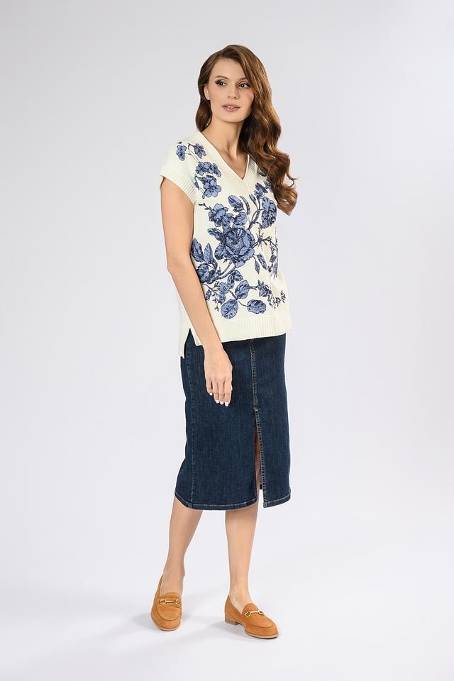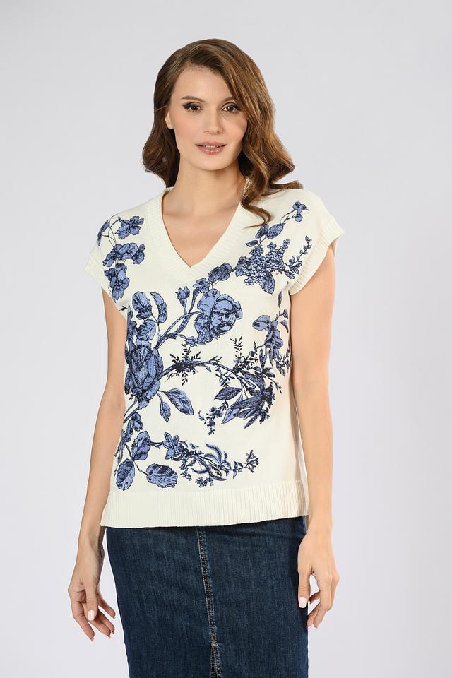 Этот женский жилет от i Blues выполнен в кремовом цвете и украшен эффектным цветочным принтом в синих тонах. Модель имеет V-образный вырез и короткие рукава, что делает ее идеальным выбором для теплой погоды.