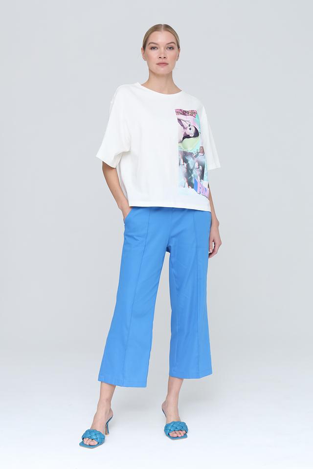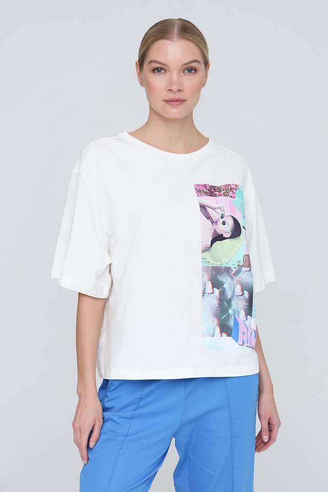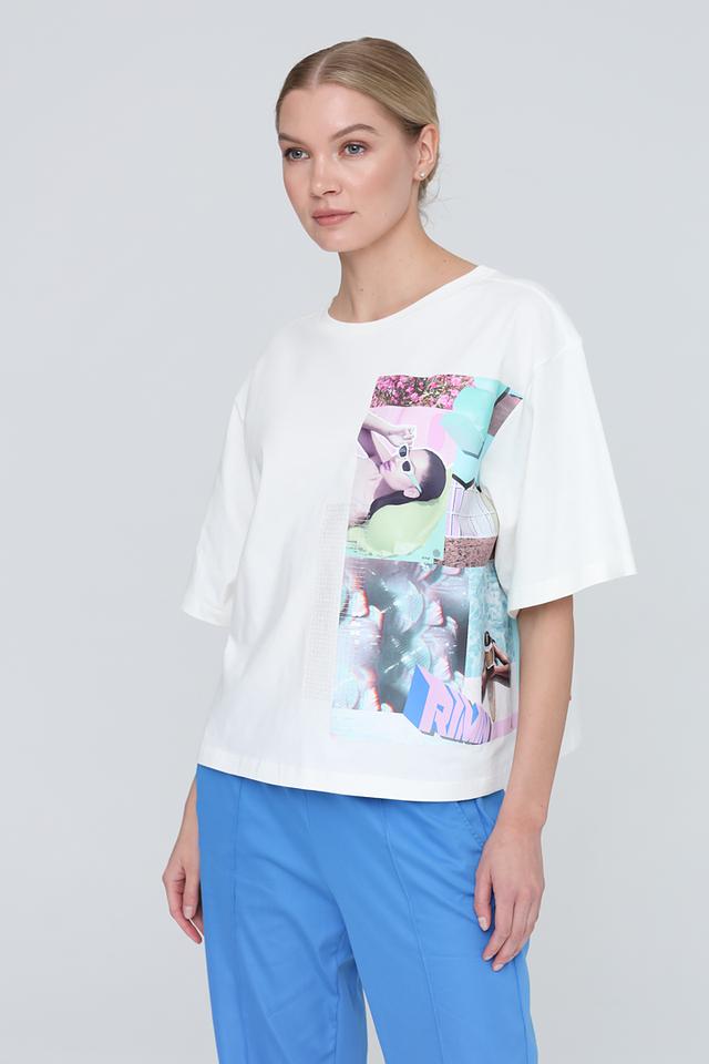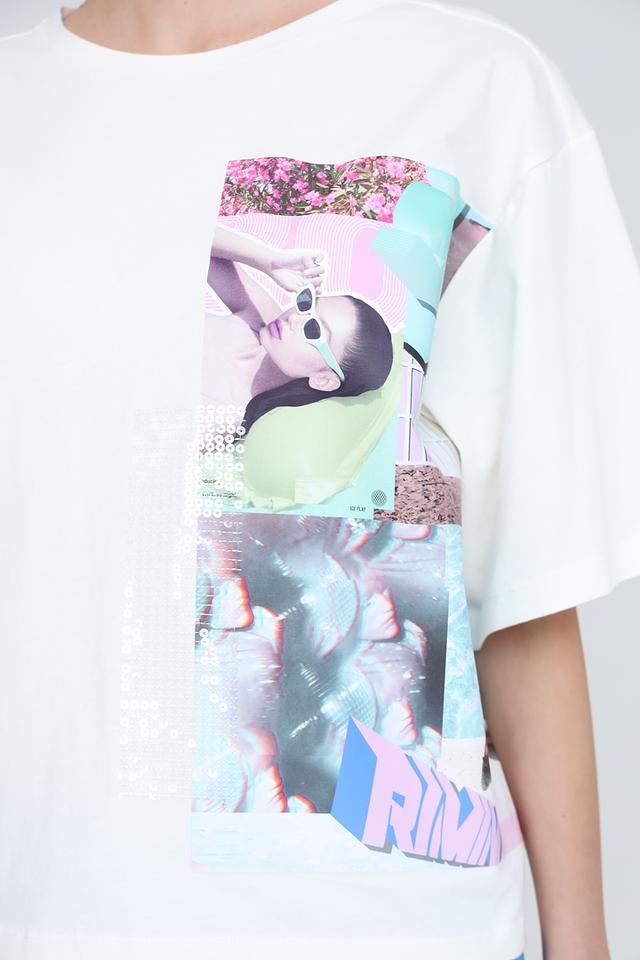 Особенностью данной футболки является яркий и оригинальный принт на лицевой стороне, выполненный в коллажной технике с использованием различных изображений и цветовых акцентов. Принт включает в себя элементы в розовых, голубых и пастельных тонах, что делает футболку выразительной и запоминающейся.