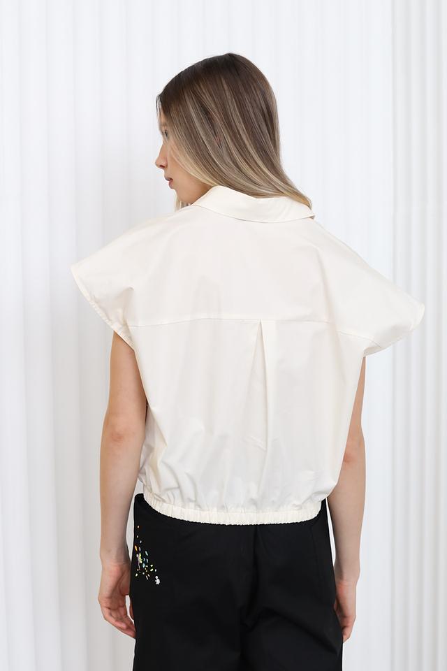 Воротник-стойка и короткие рукава-крылышки придают блузе современный вид. Застежка на пуговицы спереди. Эластичный пояс на талии обеспечивает посадку по фигуре. Эта блуза станет отличным акцентом в вашем повседневном или вечернем образе.