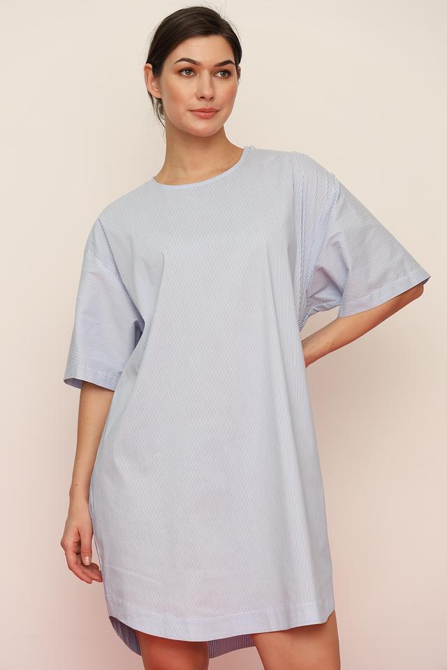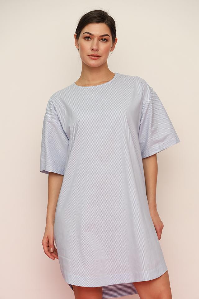 Это платье от Ice Play выполнено в свободном крое, что обеспечивает максимальный комфорт в носке. Основной цвет платья – голубой, дополненный вертикальной полоской. Модель имеет короткие рукава и круглый вырез горловины.
