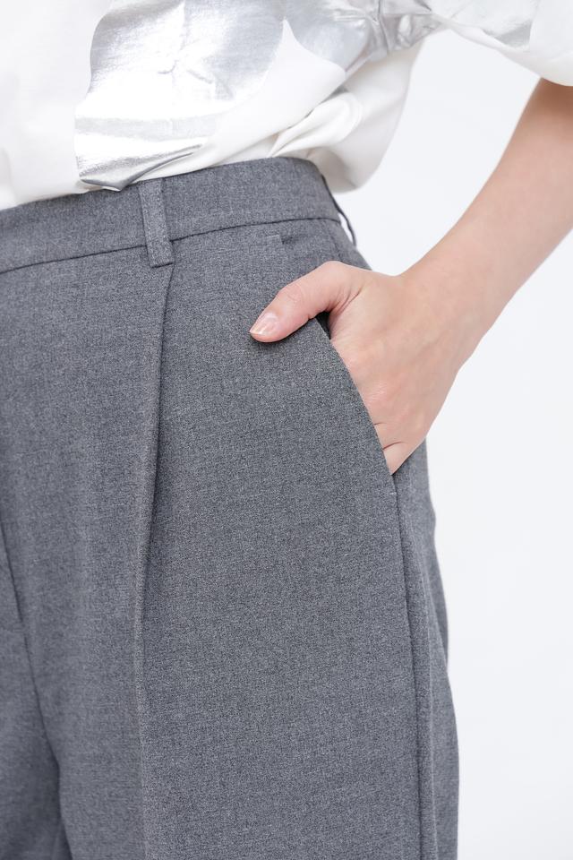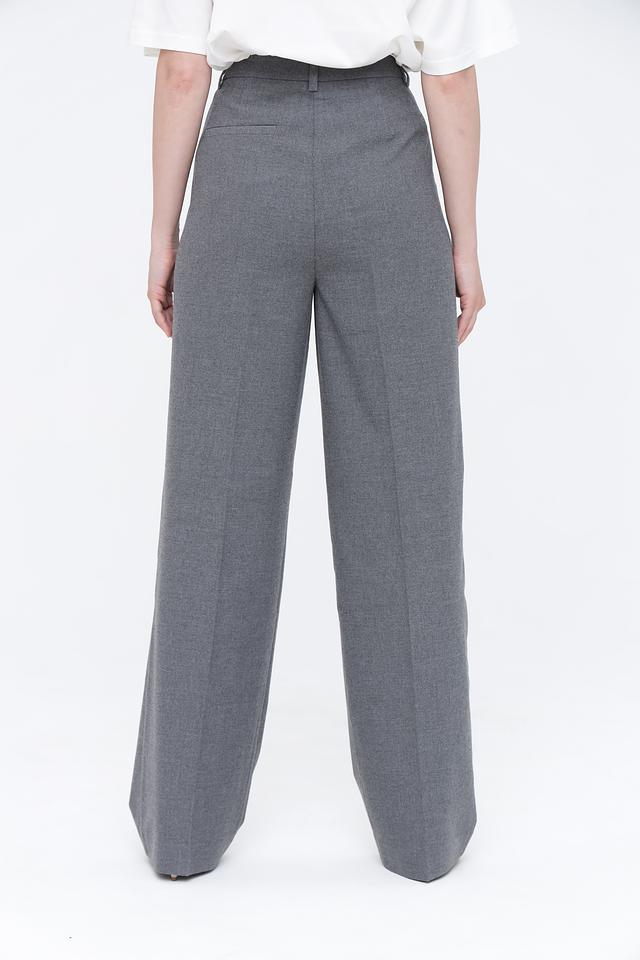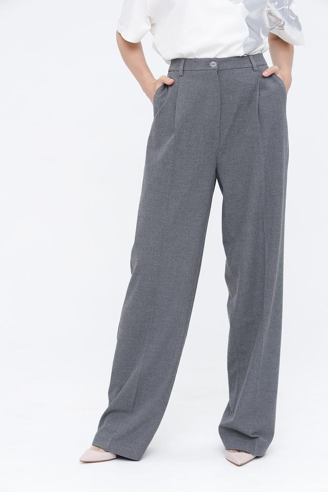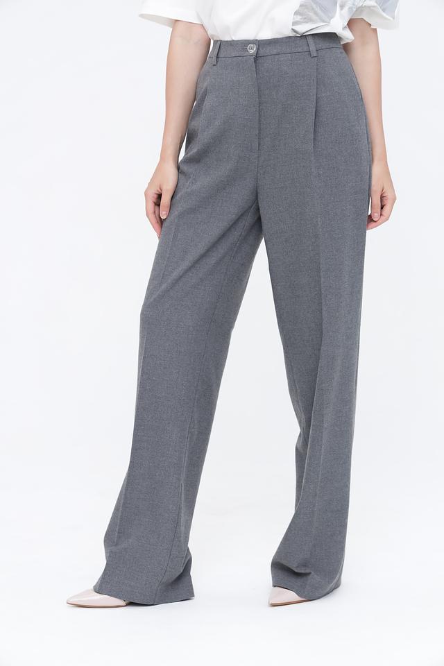 Брюки имеют классический крой с высокой посадкой и широкими штанинами, что визуально удлиняет силуэт. Передняя часть брюк дополнена защипами, придающими им более структурированный вид. Застежка выполнена на молнию и пуговицу. Материал брюк — это сочетание полиэстера, вискозы и эластана, обеспечивающее комфорт в носке и хорошую посадку по фигуре.
