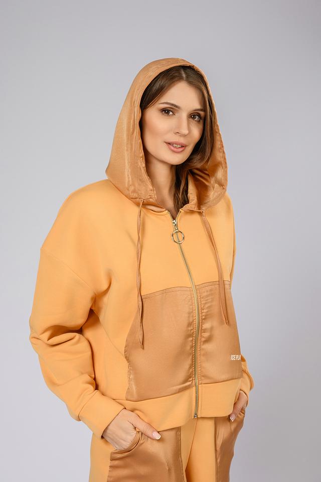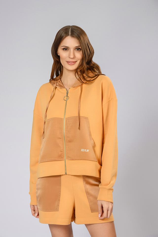 Женский джемпер Ice Play абрикосового цвета с застежкой-молнией и капюшоном. Модель выполнена из мягкого хлопка с добавлением полиэстера, имеет удобный крой и стильный дизайн с контрастными вставками. Состав: хлопок 63%, полиэстер 37%