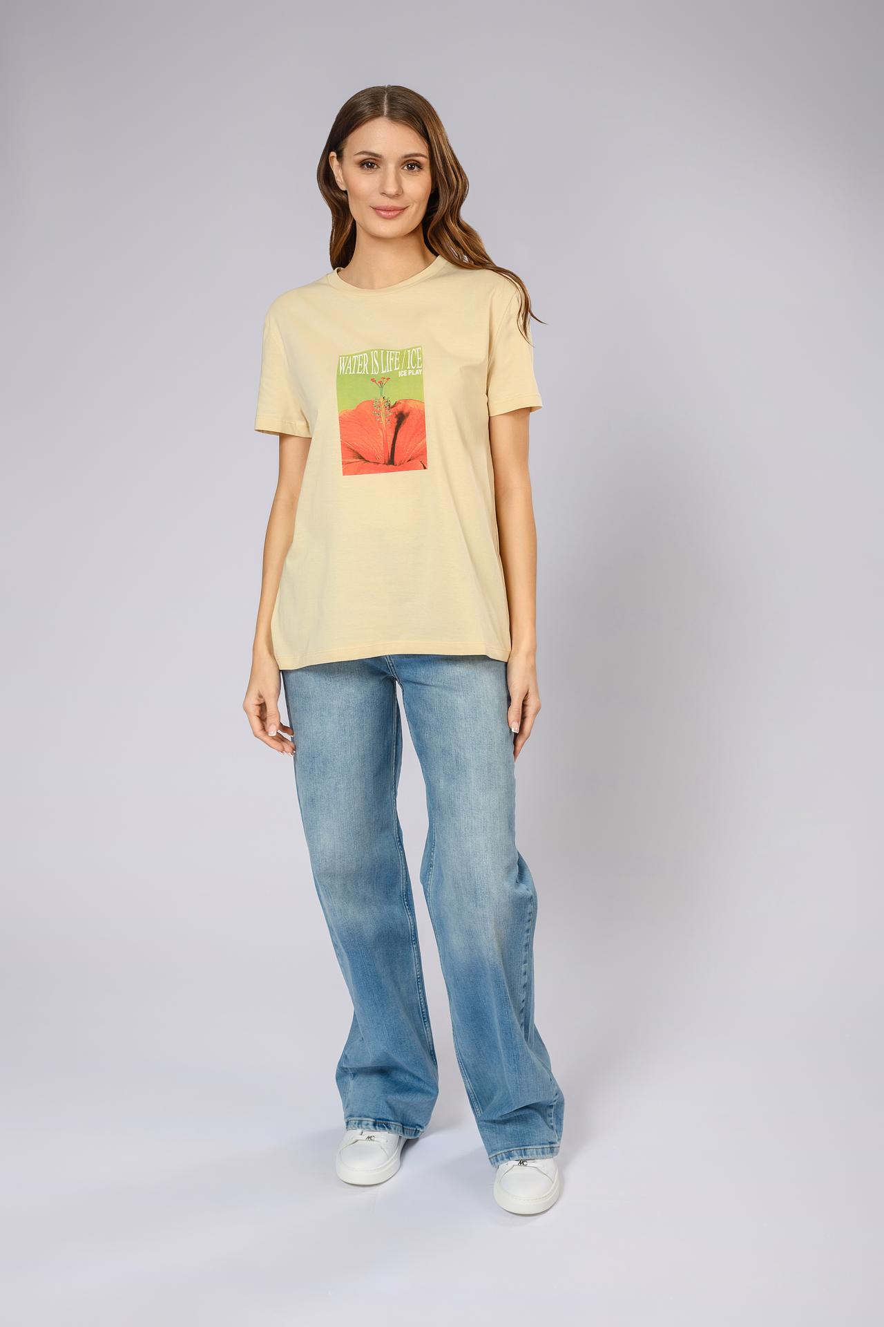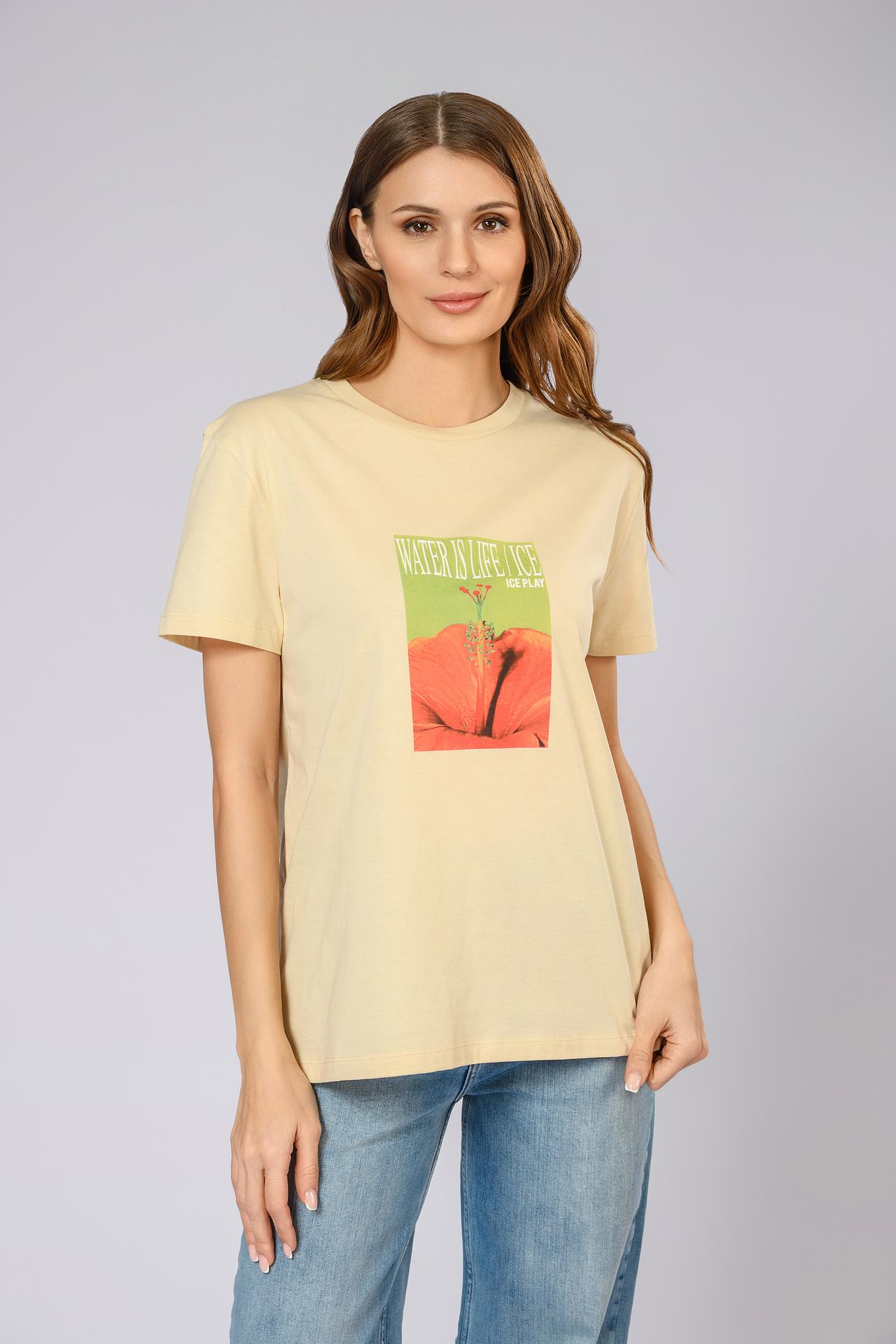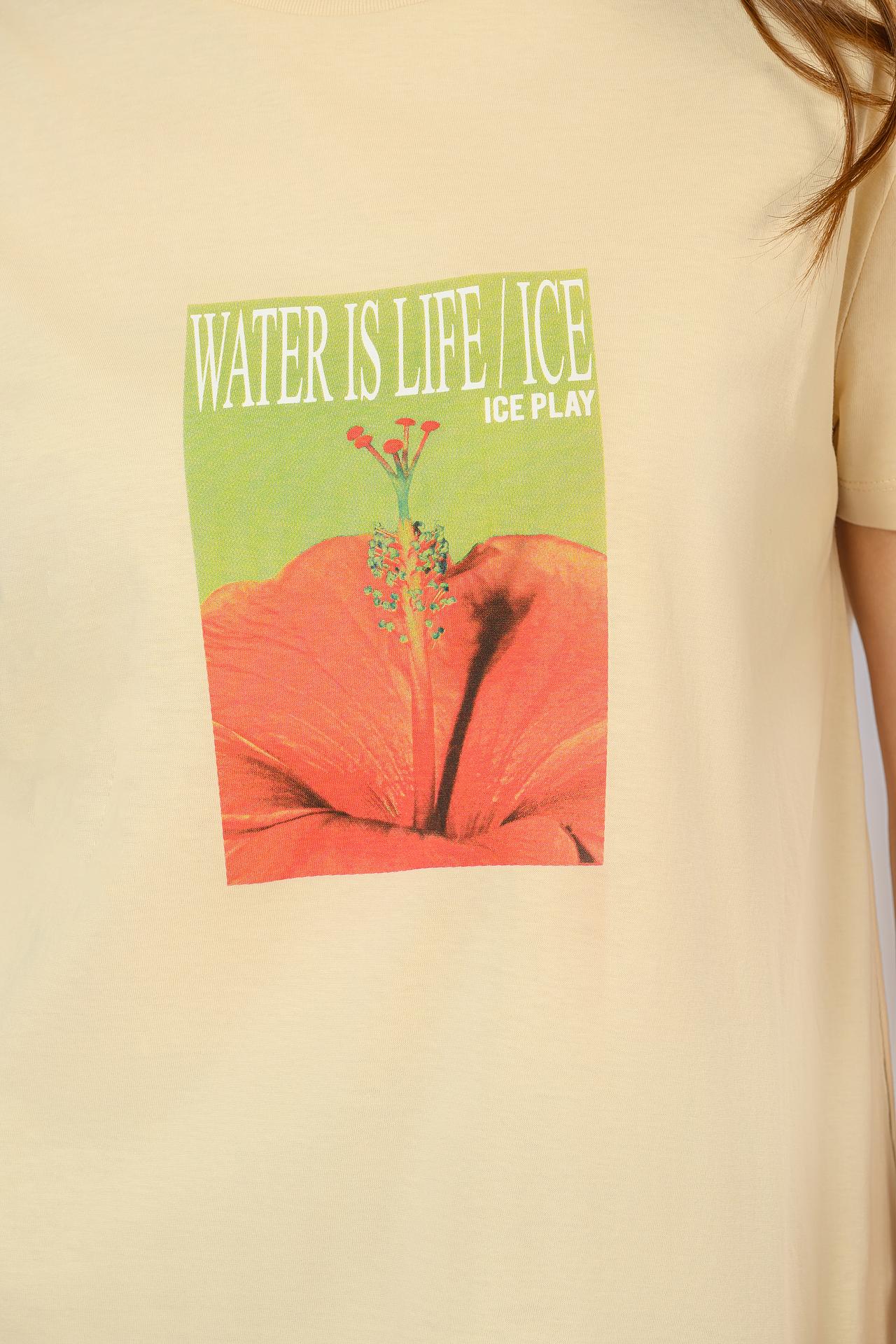 Удобная женская футболка Ice Play в универсальном бежевом цвете — идеальное решение для создания стильных повседневных образов. Модель отличается классическим прямым кроем, короткими рукавами и круглым вырезом, что обеспечивает максимальный комфорт. Центральный принт с изображением яркого цветка и надписью «WATER IS LIFE / ICE ICE PLAY» придает футболке оригинальность и выразительность.