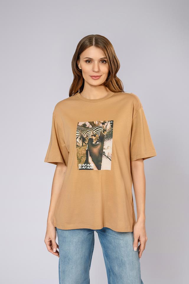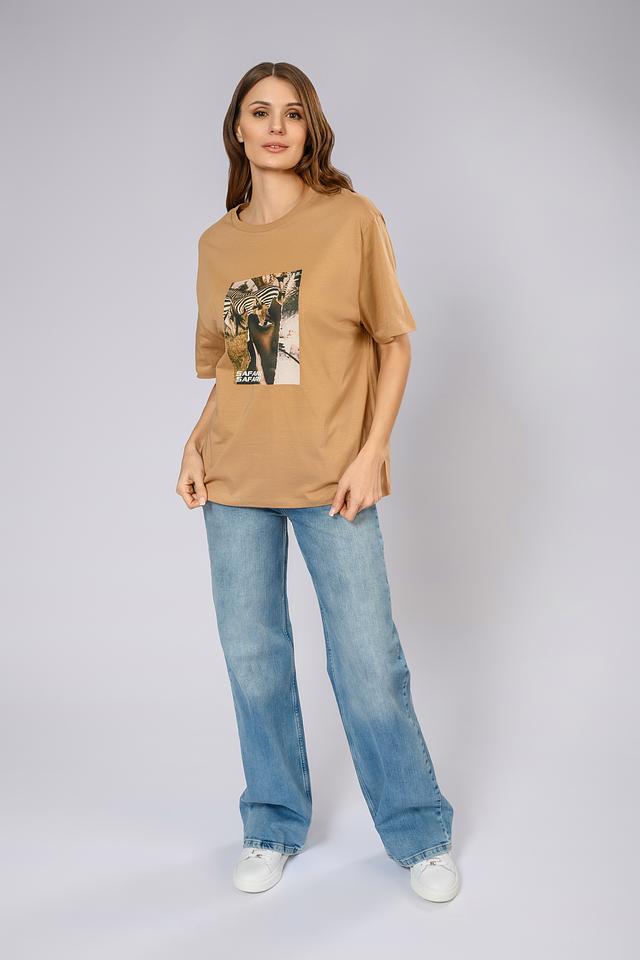 Футболка имеет свободный крой оверсайз, который позволяет создать расслабленный и модный образ. Главной особенностью модели является яркий принт в стиле сафари с изображением зебр и надписью "SAFARI".