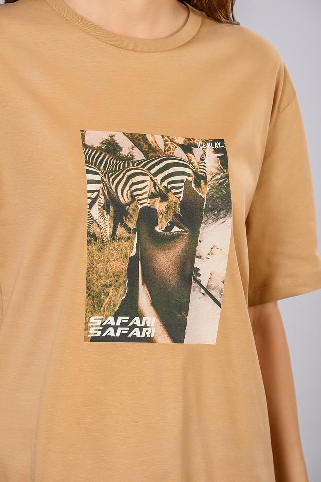 Женская футболка Ice Play бежевого цвета с ярким принтом в стиле сафари. Модель оверсайз кроя выполнена из мягкого 100% хлопка, обеспечивая комфорт в повседневной носке. Состав: хлопок 100%
