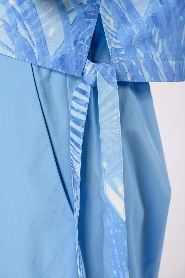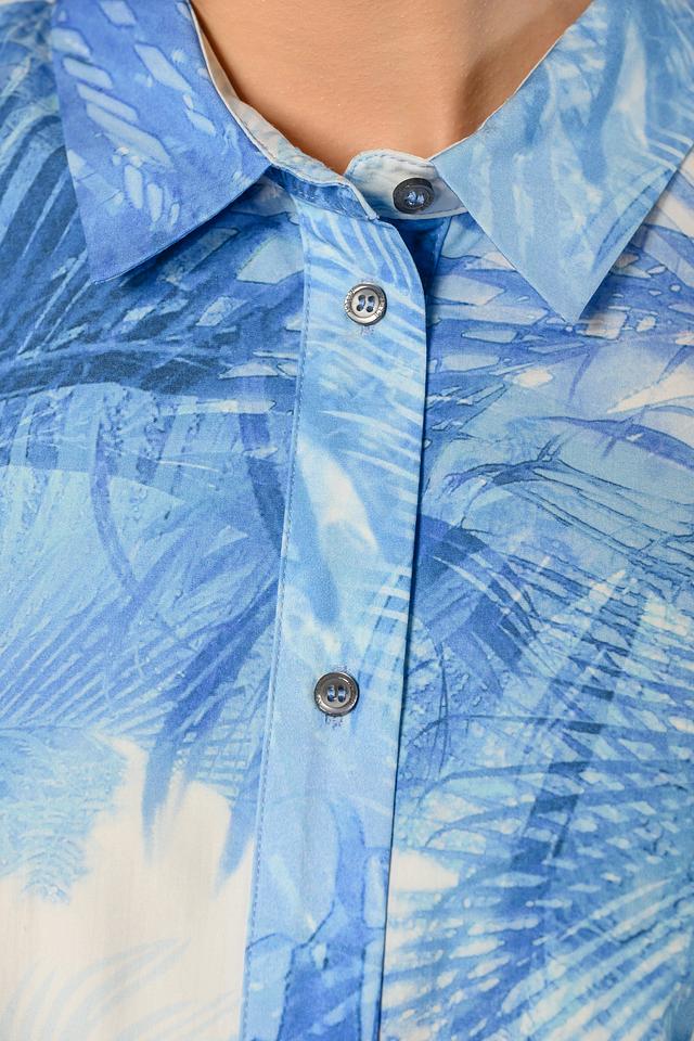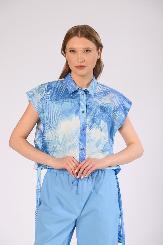 Блуза имеет прямой крой, короткий рукав и классический воротник. Главная особенность модели – яркий принт с изображением пальмовых листьев в голубых тонах, который придает ей неповторимый вид.
