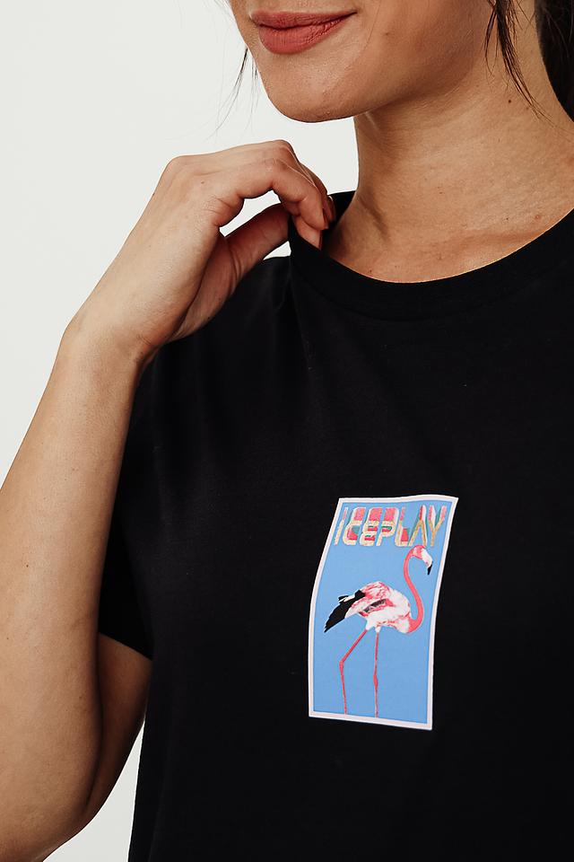 Чёрная футболка Ice Play с ярким принтом фламинго – стильный выбор для повседневного образа. Изготовлена из 100% хлопка, обеспечивая комфорт и воздухопроницаемость. Состав: хлопок 100%