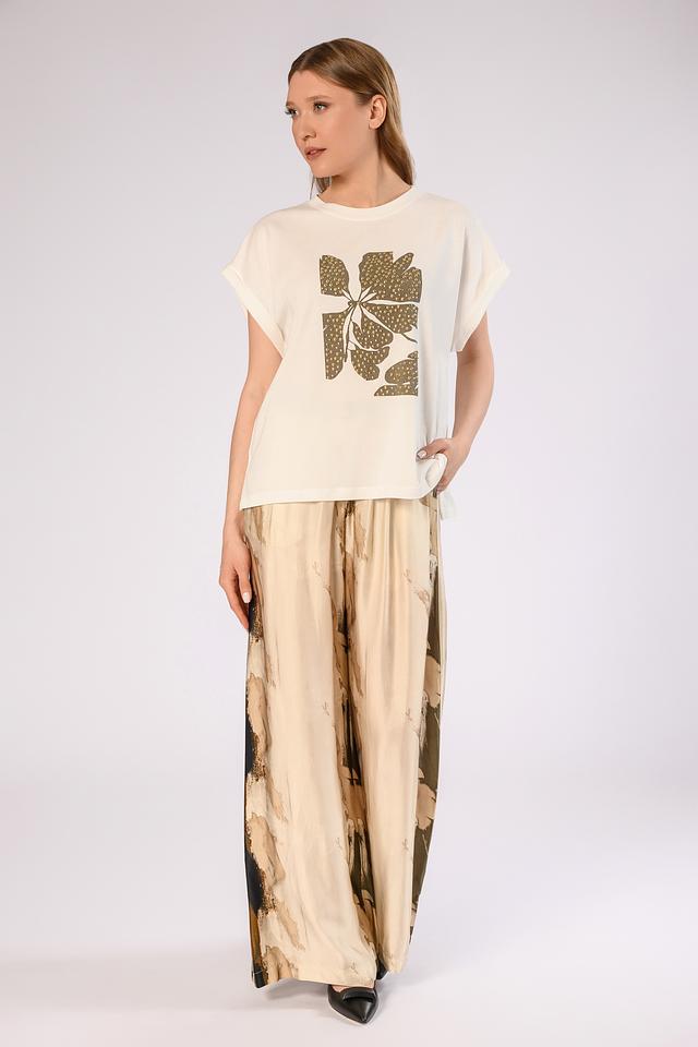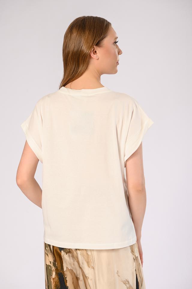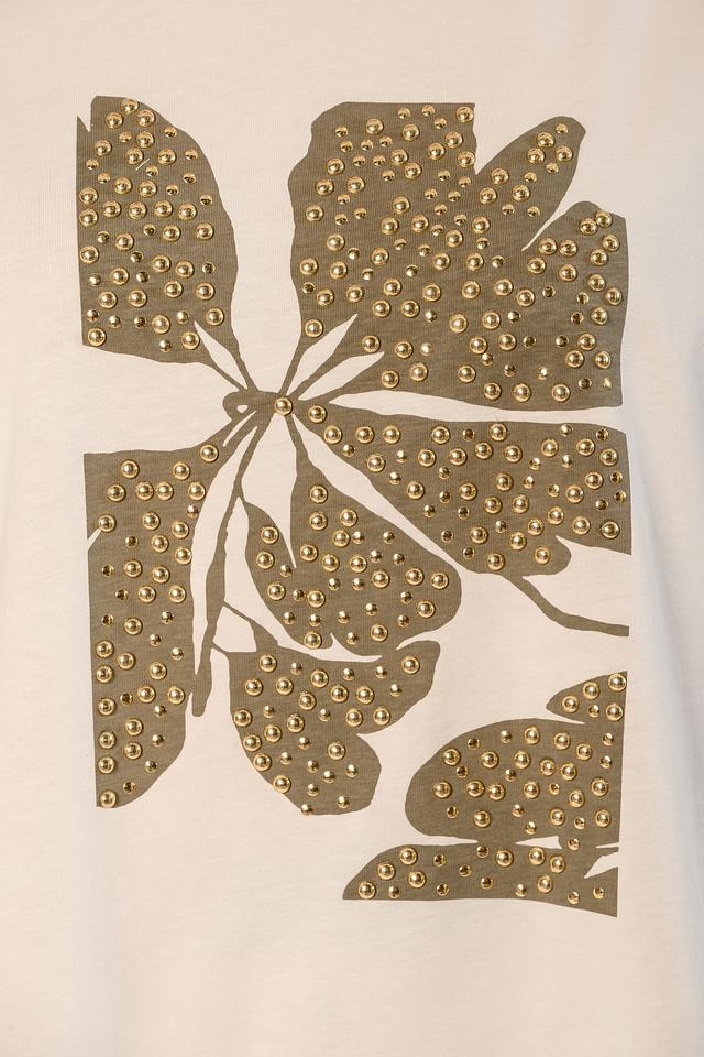 Оригинальный дизайн с золотистым декором добавляет образу изысканности и делает эту футболку ярким акцентом вашего стиля.