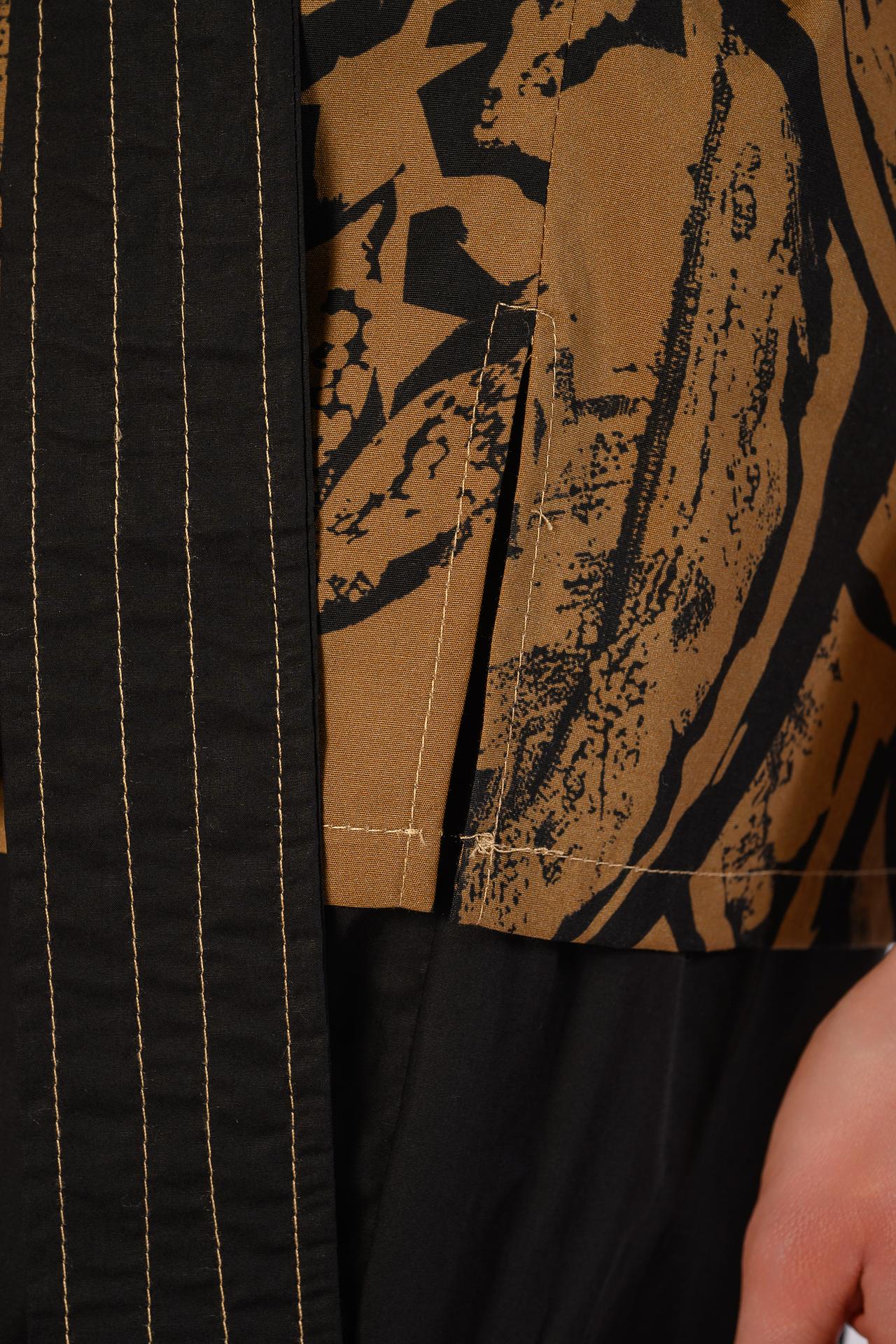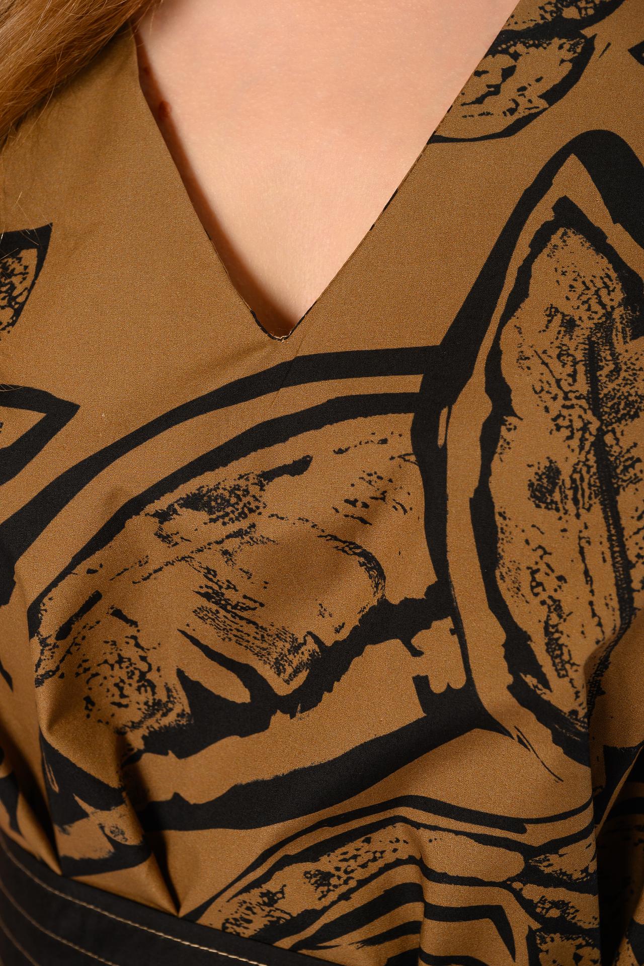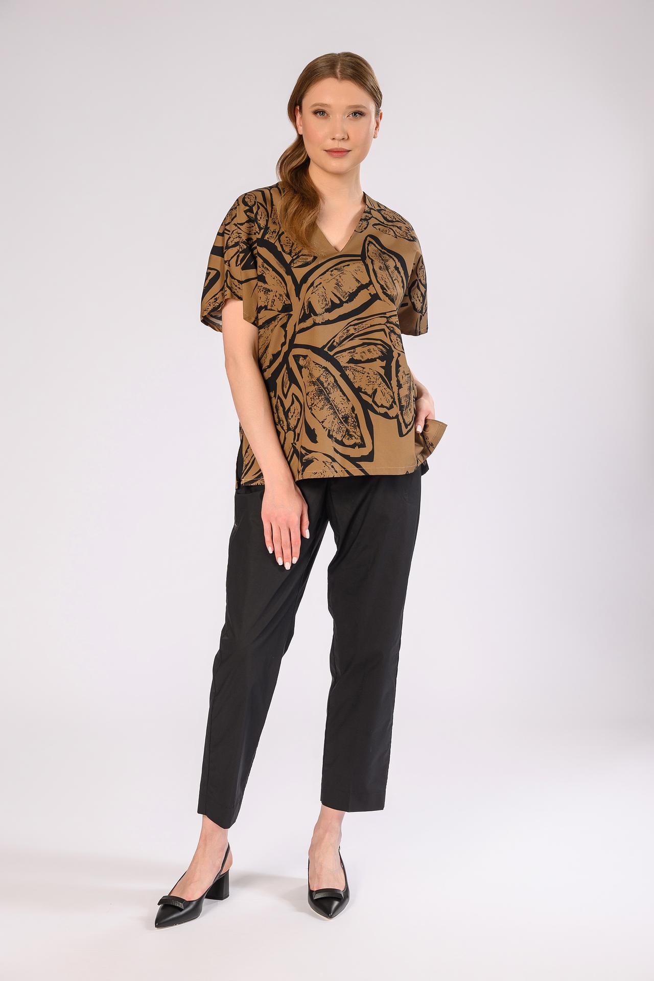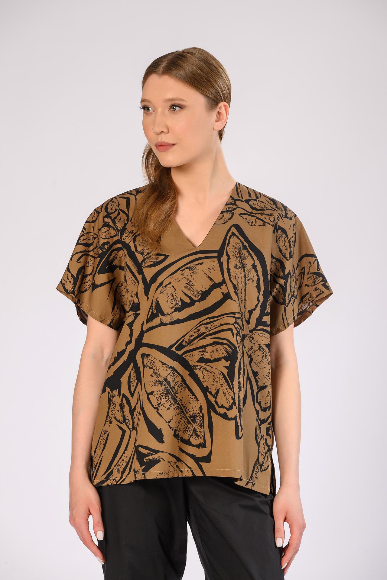 - Оригинальный дизайн: Коричневая основа дополнена контрастным черным растительным принтом, который придает блузе изысканный и запоминающийся вид. Этот принт подчеркивает индивидуальность и современный стиль.