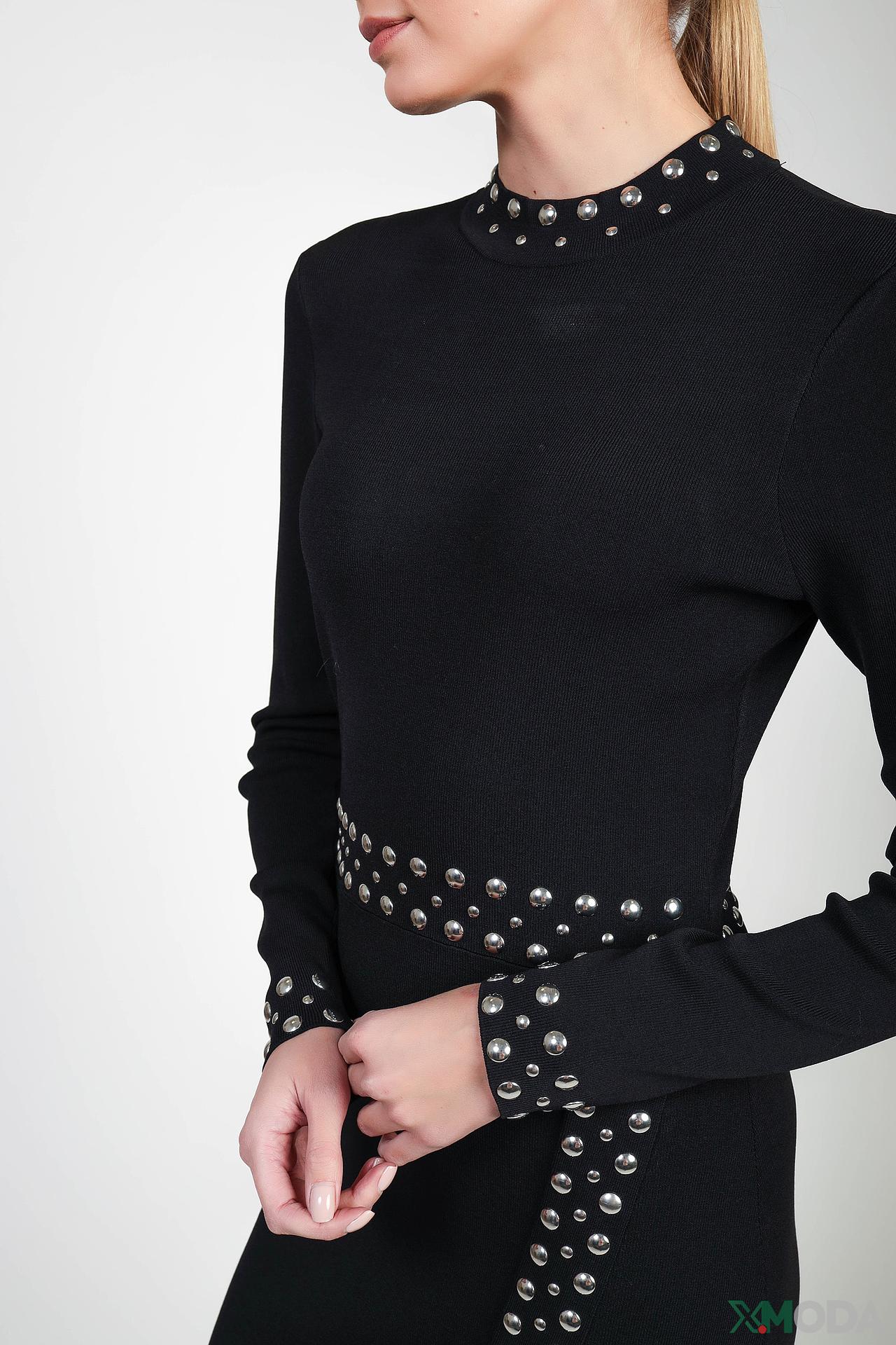 - Дизайн: Классический силуэт платья подчеркивает достоинства фигуры, а декоративные серебристые заклепки придают образу изысканность и актуальность. Высокий воротник-стойка и длинные рукава создают элегантный образ.