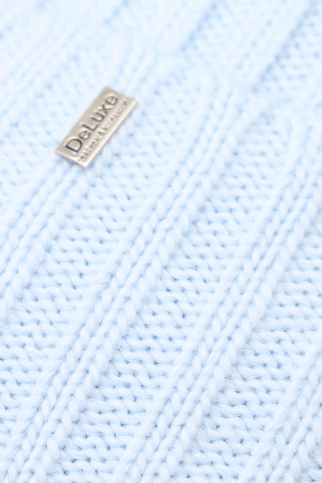 Голубой цвет и рельефное плетение придают шапке особый шарм. Аксессуар плотно прилегает к голове, защищая от ветра и мороза. Небольшой металлический логотип бренда Deluxe добавляет шапке изысканности.