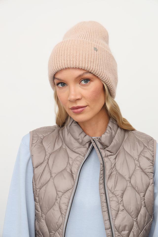 Шапка выполнена в приятном бежевом цвете, который легко сочетается с различными элементами одежды. Особое внимание привлекает аккуратная вязаная фактура и небольшой металлизированный логотип бренда, добавляющие шапке изысканности.