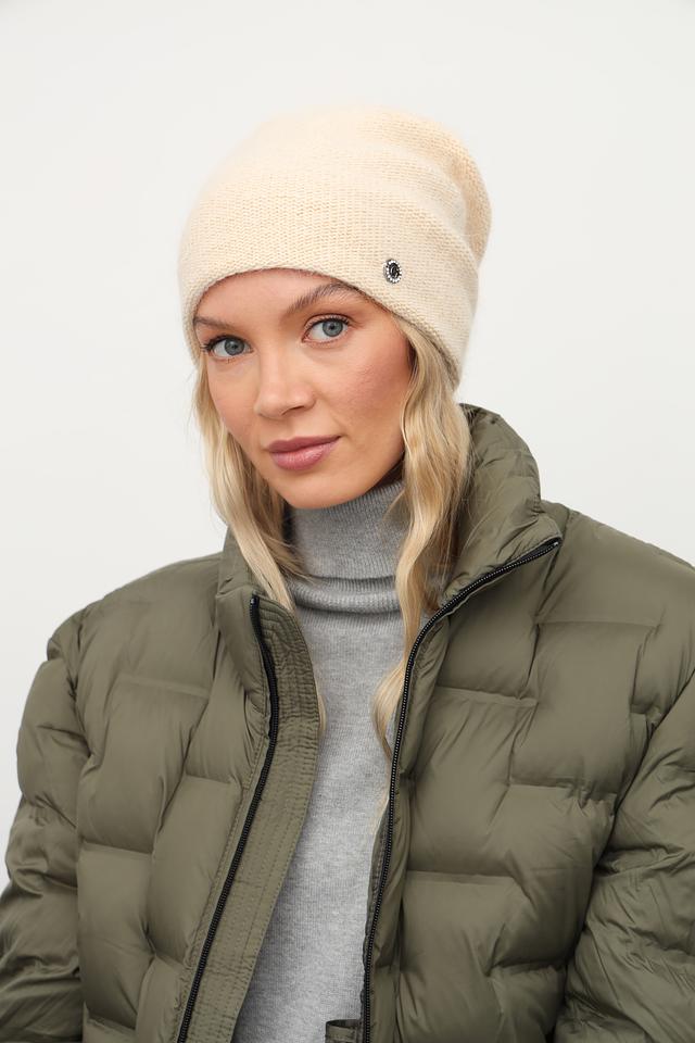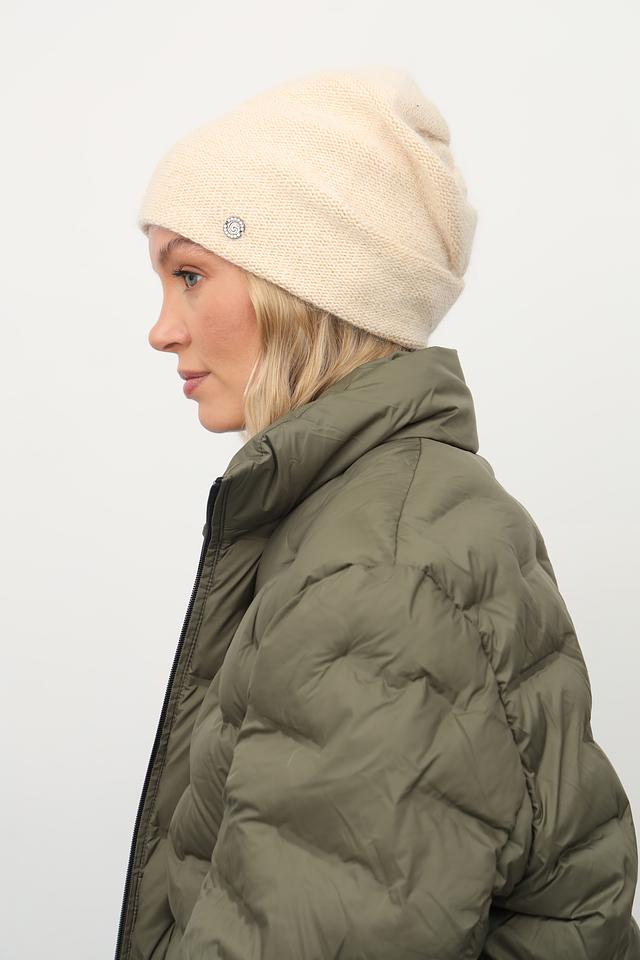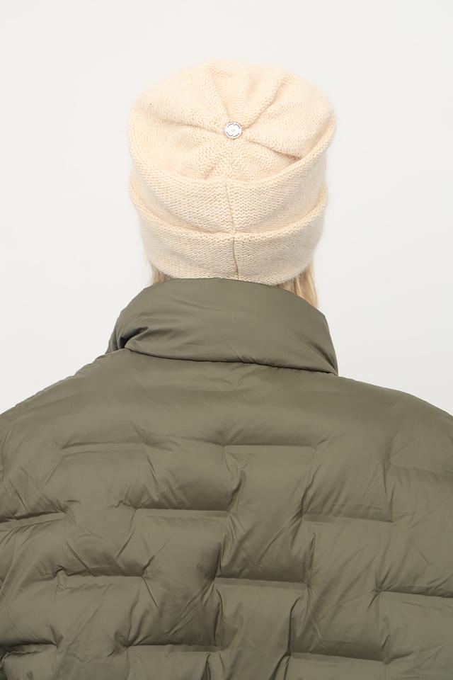 Шапка выполнена в нежном бежевом цвете и имеет классическую форму. Декорирована металлическим элементом с логотипом бренда, что придает ей особый шарм и узнаваемость.