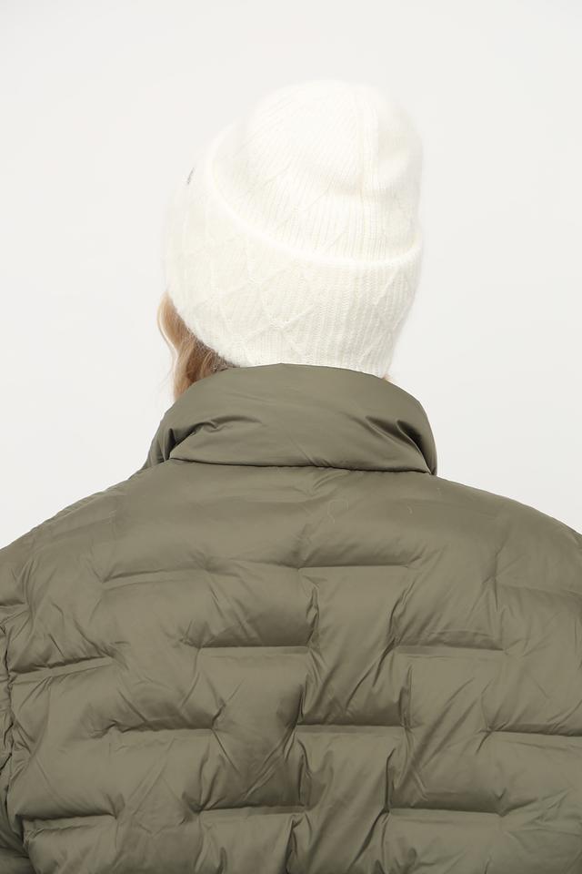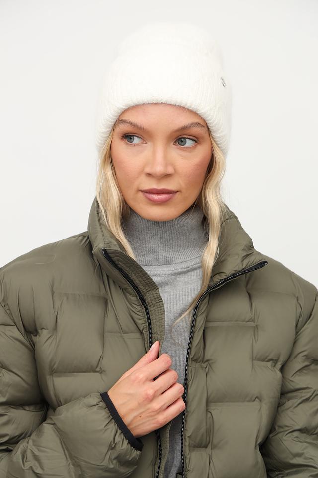 На шапке расположен небольшой металлический логотип бренда, который добавляет изысканности и узнаваемости. Белый цвет шапки универсален и легко сочетается с различными видами верхней одежды и повседневной одеждой. Состав изделия включает 30% ангоры, 30% вискозы, 30% нейлона и 10% шерсти.