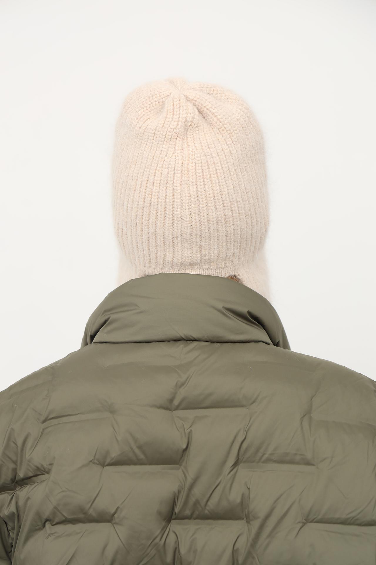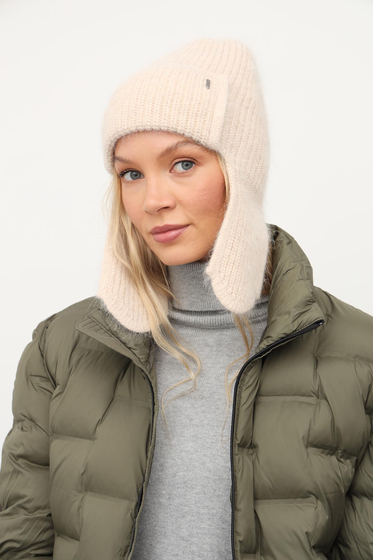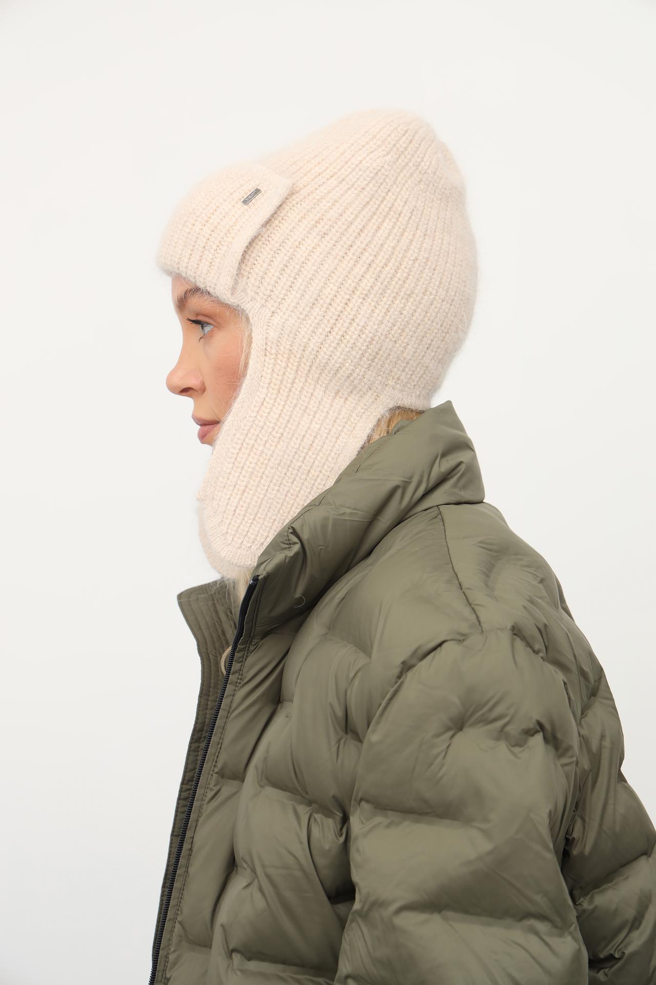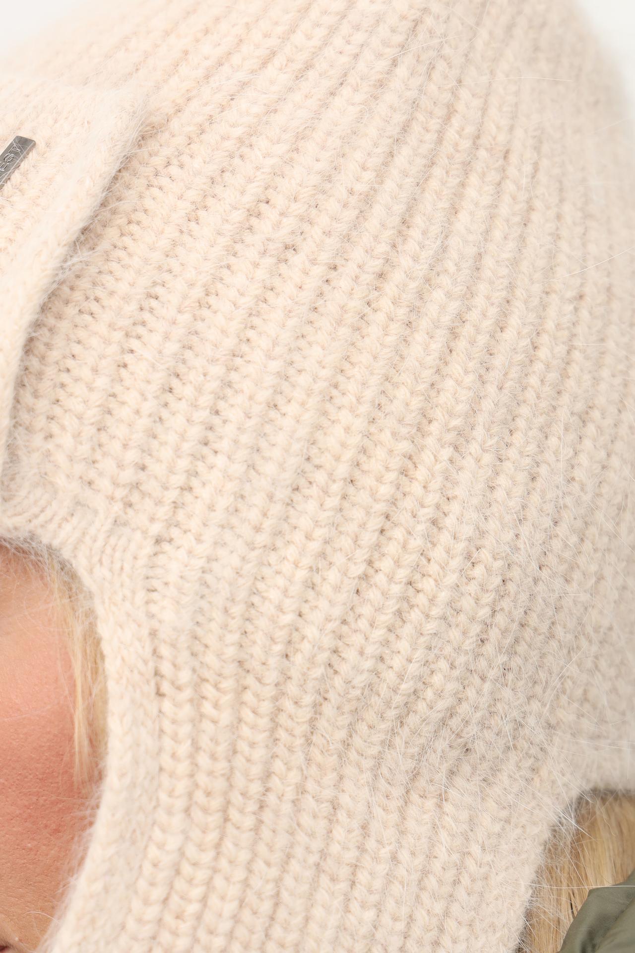Дизайн шапки сочетает классическую форму с современными элементами, такими как отворот и удлиненные боковые части, которые дополнительно защищают уши от холода. Мягкая фактура вязки и нейтральный бежевый цвет делают эту модель универсальной, легко сочетающейся с различными стилями верхней одежды.