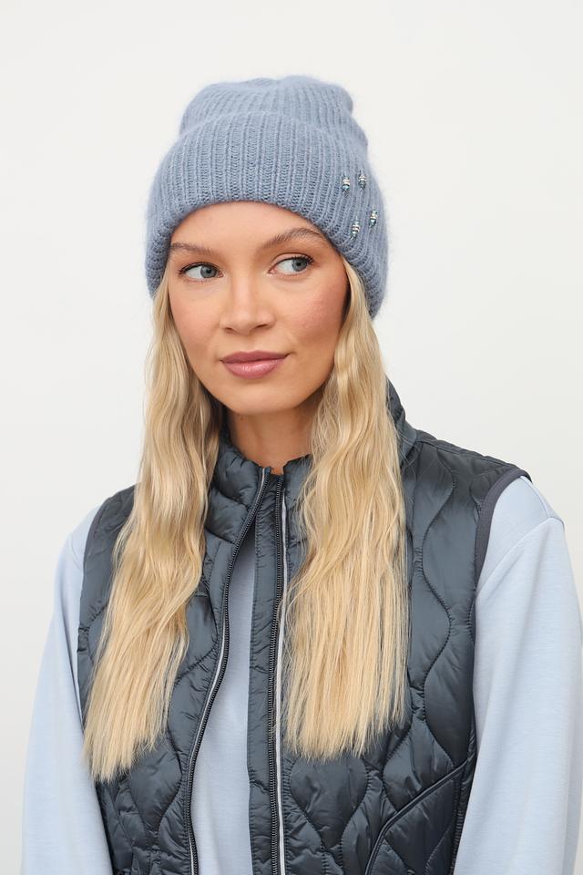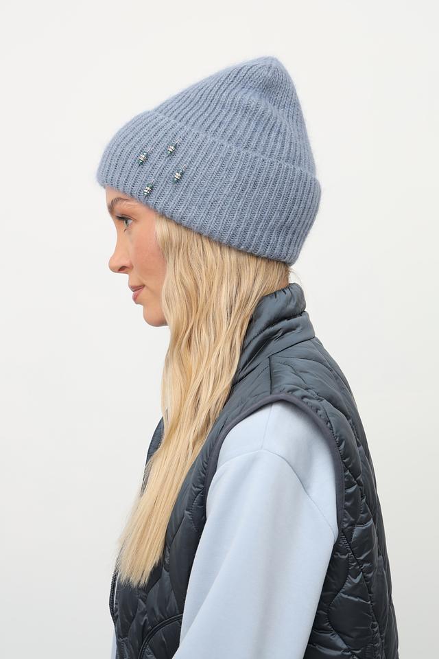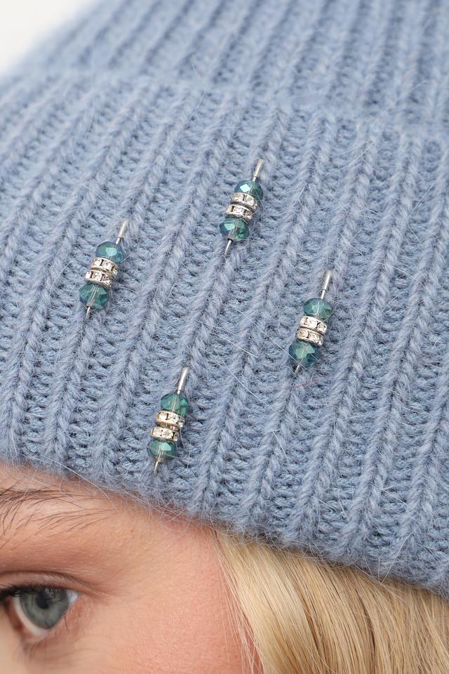 Голубая вязаная шапка Julia Florenzi с оригинальным декором из бусин. Изготовлена из мягкой пряжи с добавлением ангоры и вискозы. Стильный и уютный аксессуар для прохладной погоды. Состав: ангора 30%, вискоза 30%, нейлон 30%, шерсть 10%