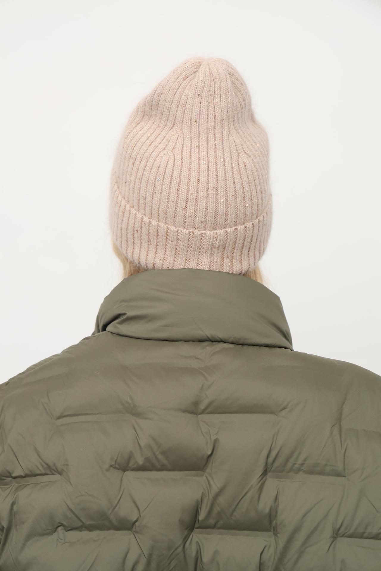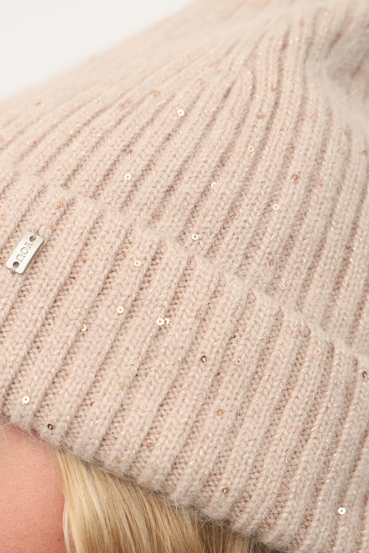 - Элегантный дизайн. Классическая форма бини и фактурная вязка дополнены россыпью мелких, блестящих пайеток, которые придают шапке особый праздничный вид и утонченность.