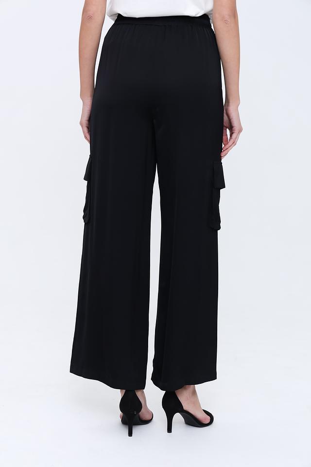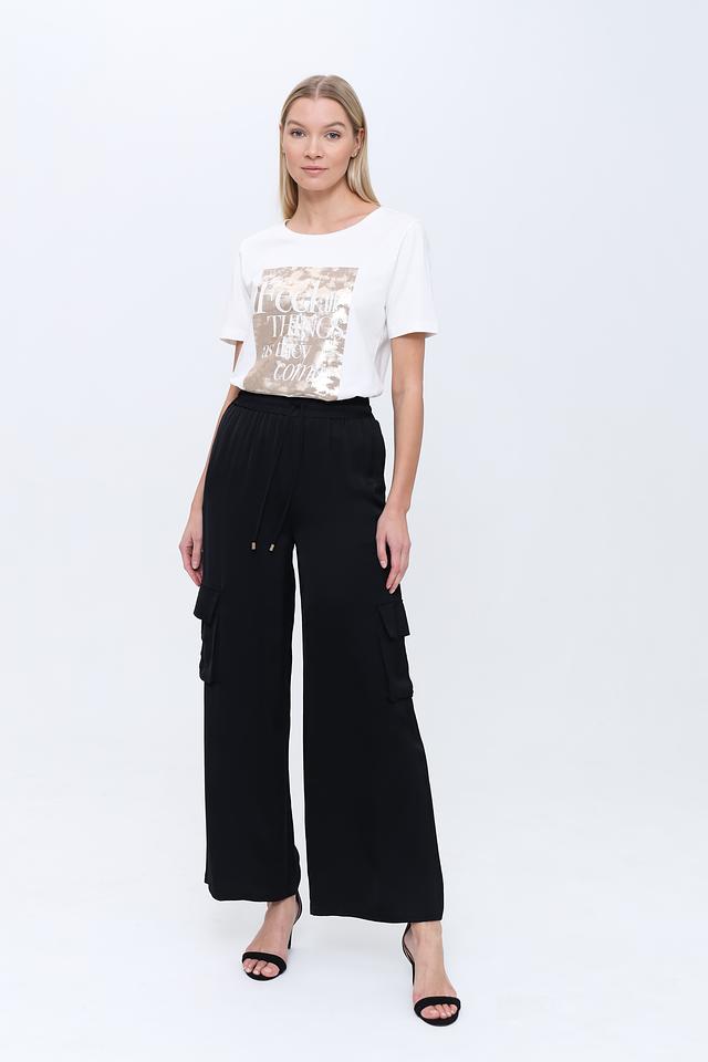 Брюки имеют завышенную талию, которая визуально удлиняет ноги и подчеркивает фигуру. Удобный пояс на кулиске обеспечивает комфортную посадку и позволяет регулировать обхват талии. По бокам брюк расположены функциональные карманы-карго, добавляющие образу практичности и динамики.