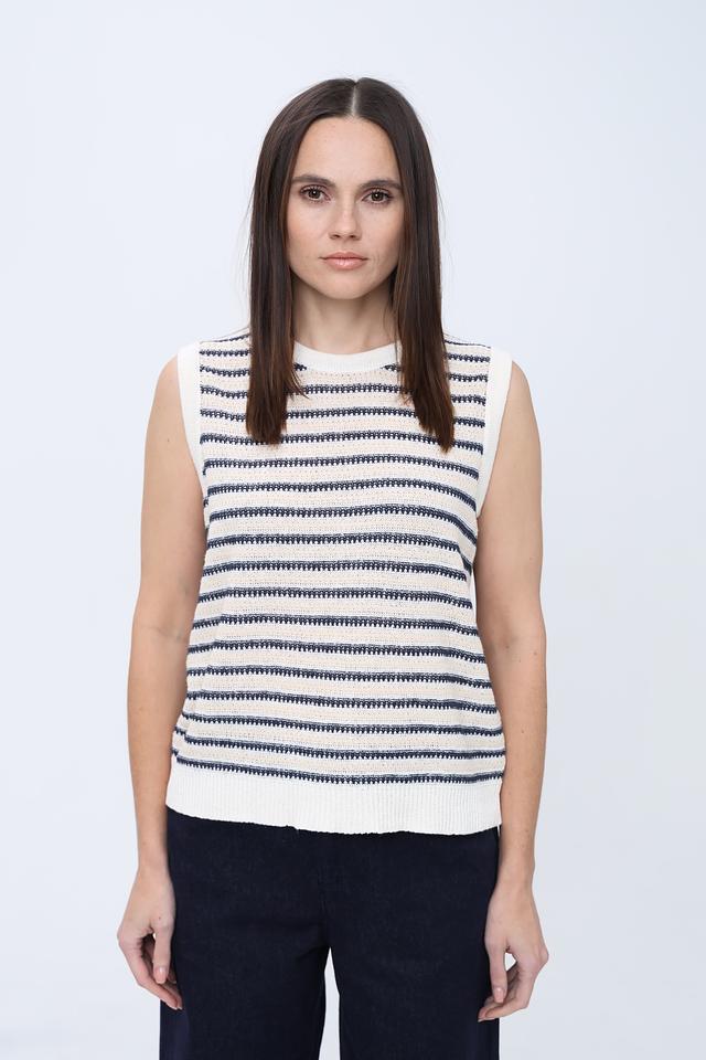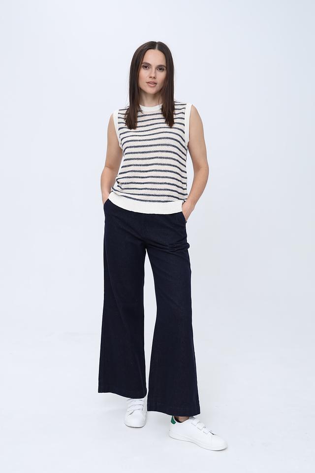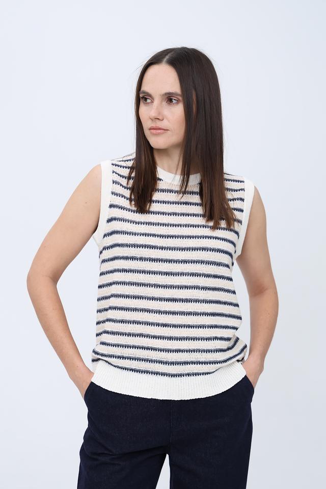 Дизайн джемпера представлен в виде горизонтальных полосок бежевого и тёмно-синего цветов. Модель имеет круглый вырез горловины и короткие рукава, что делает её идеальным выбором для тёплой погоды.
