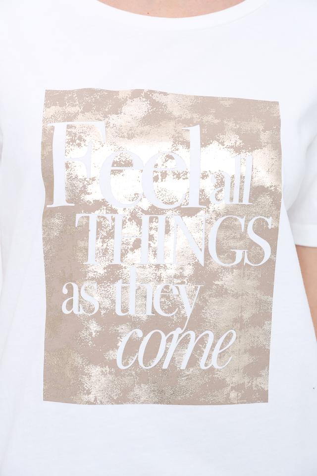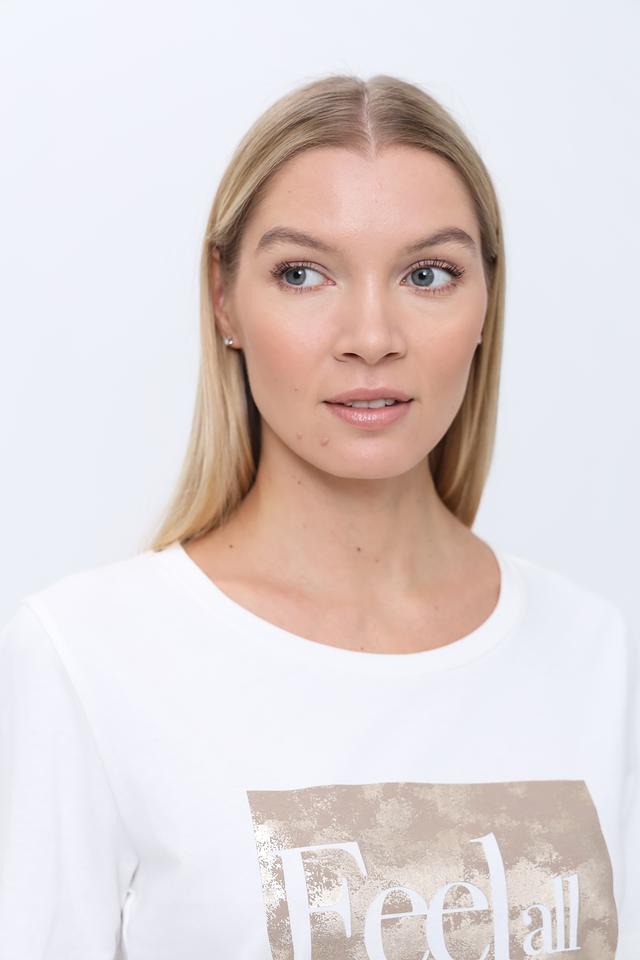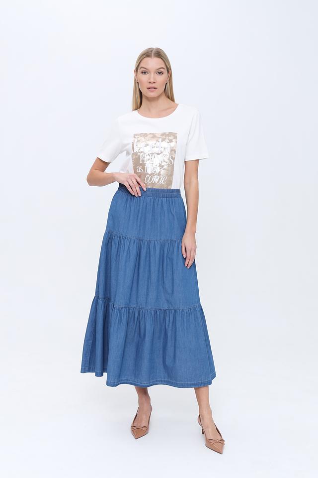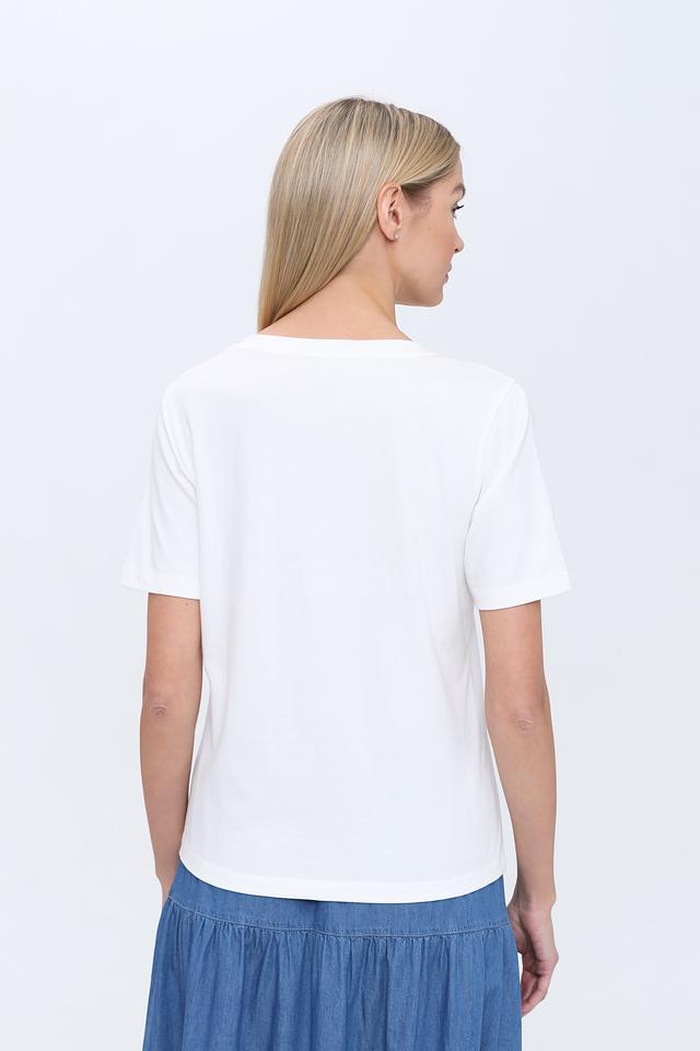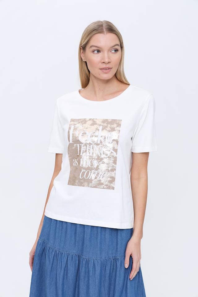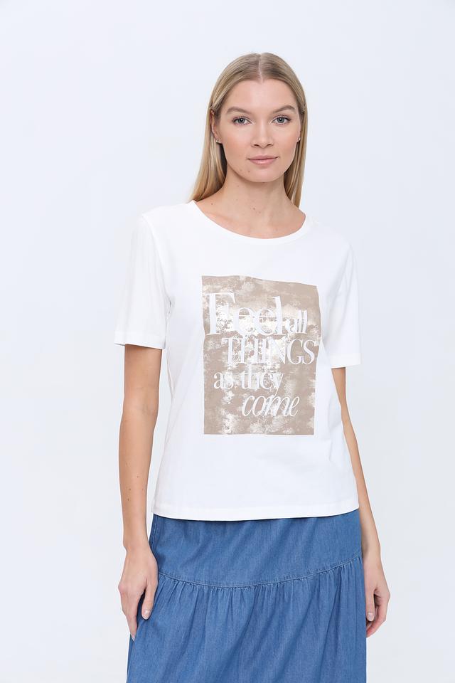 Футболка имеет классический прямой крой, который подходит для любой фигуры. Круглый вырез горловины и короткие рукава обеспечивают свободу движений. Эта футболка идеально сочетается с джинсами, юбками и шортами, позволяя создавать разнообразные образы.