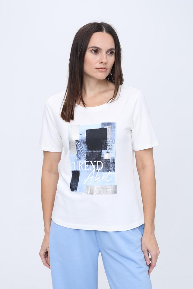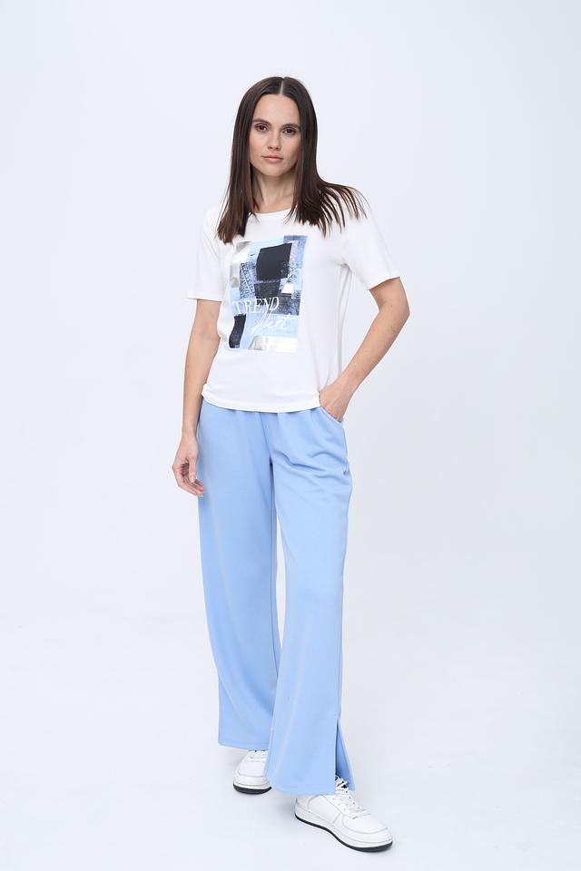 Особенностью данной модели является яркий и современный принт в сине-черной гамме, который добавляет образу индивидуальности. Футболка имеет классический прямой крой и круглый вырез горловины, что делает ее универсальной и подходящей для различных типов фигур.