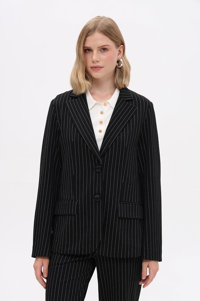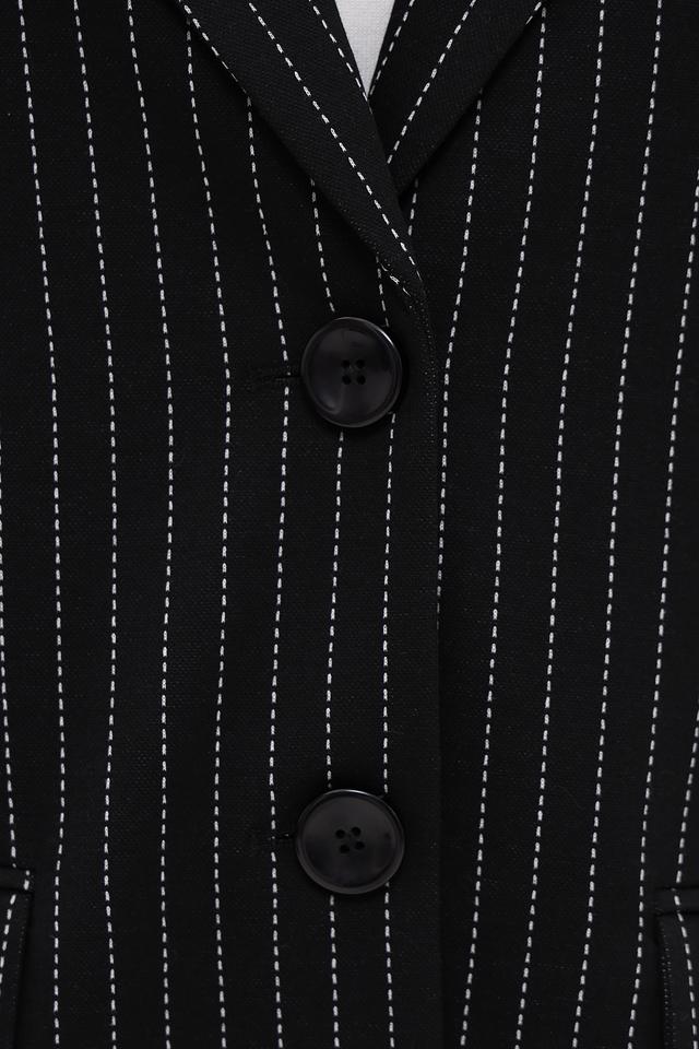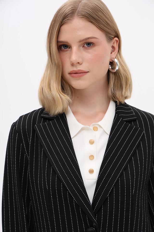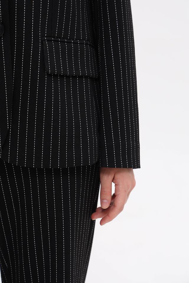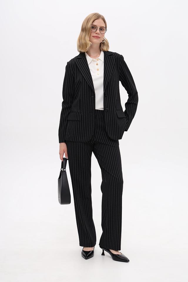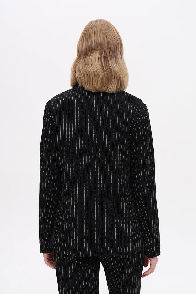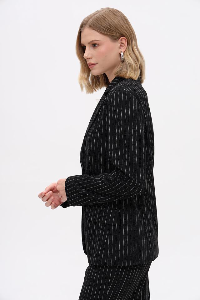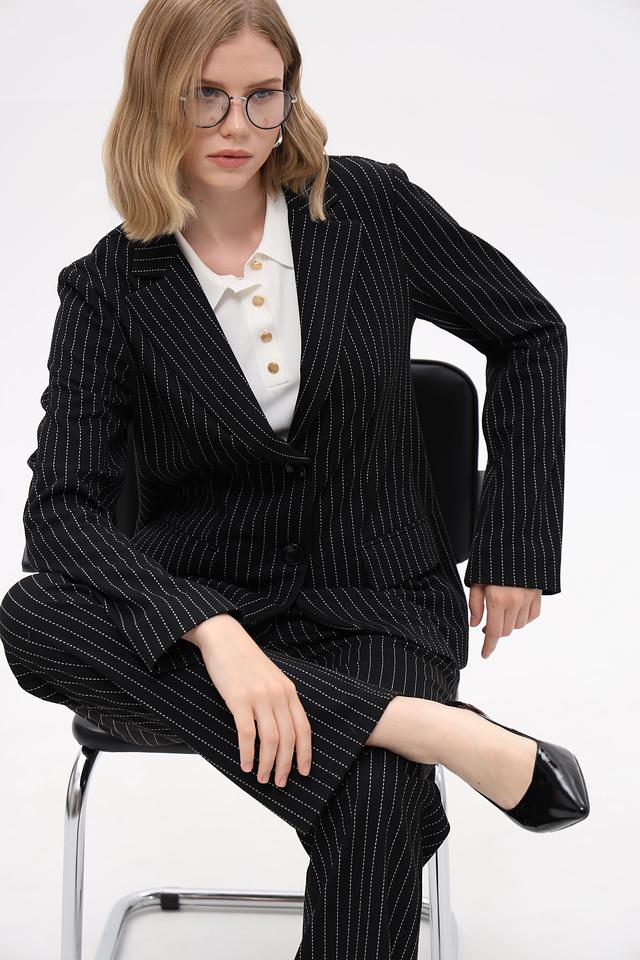 Жакет Just Valeri — это элегантный выбор для создания делового или повседневного образа. Модель выполнена в классическом чёрном цвете с вертикальной полоской, что визуально вытягивает силуэт.