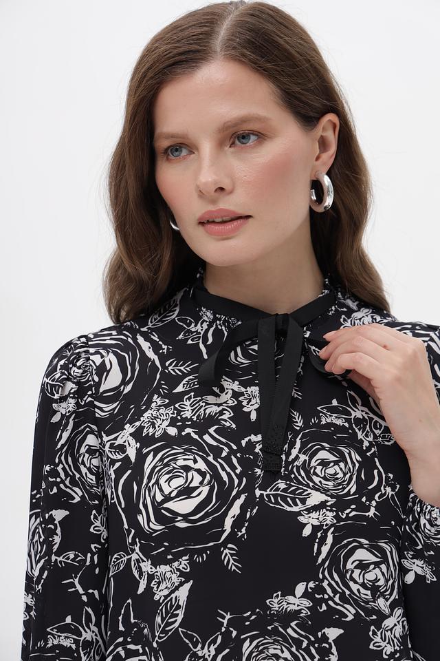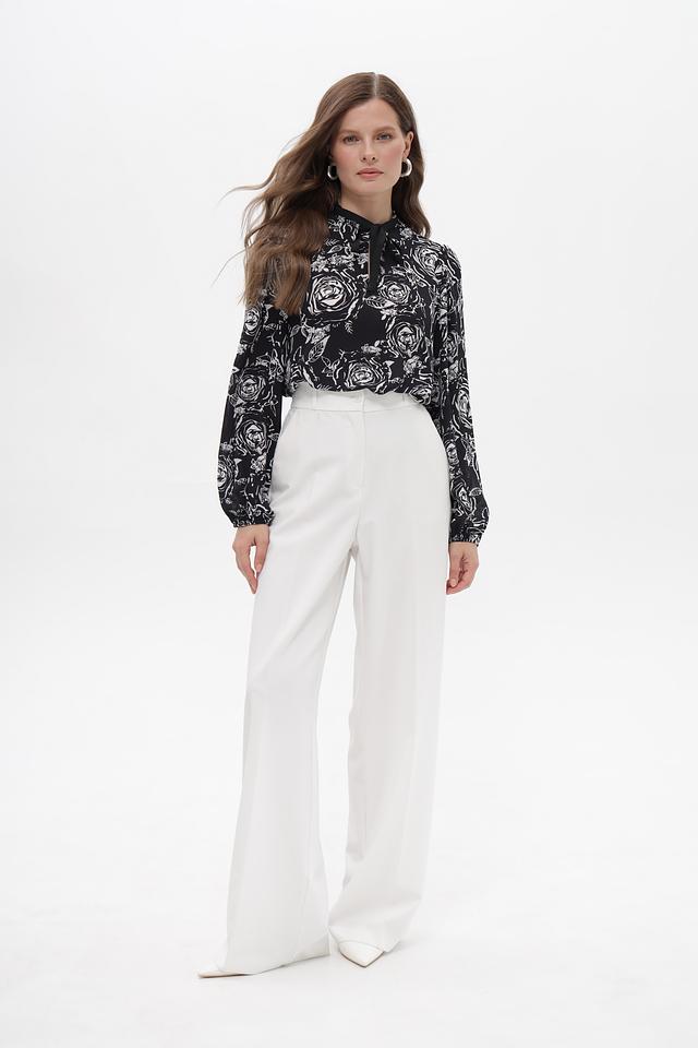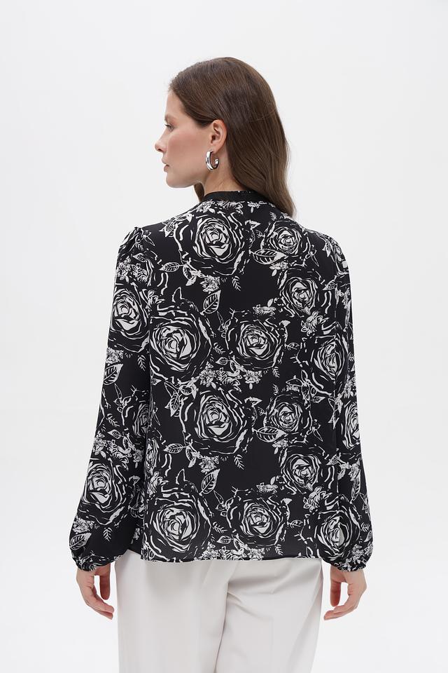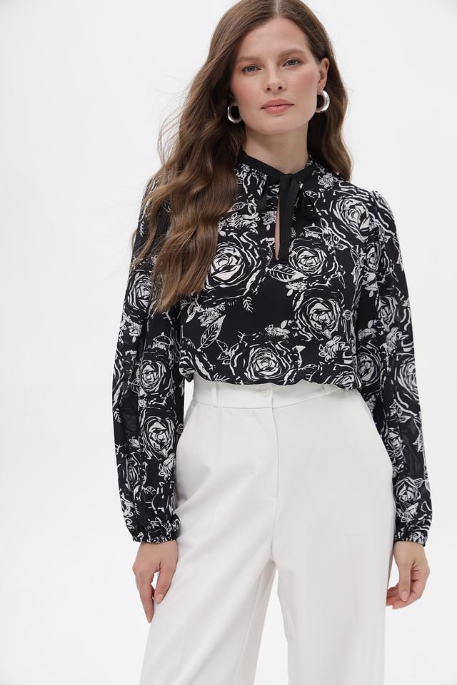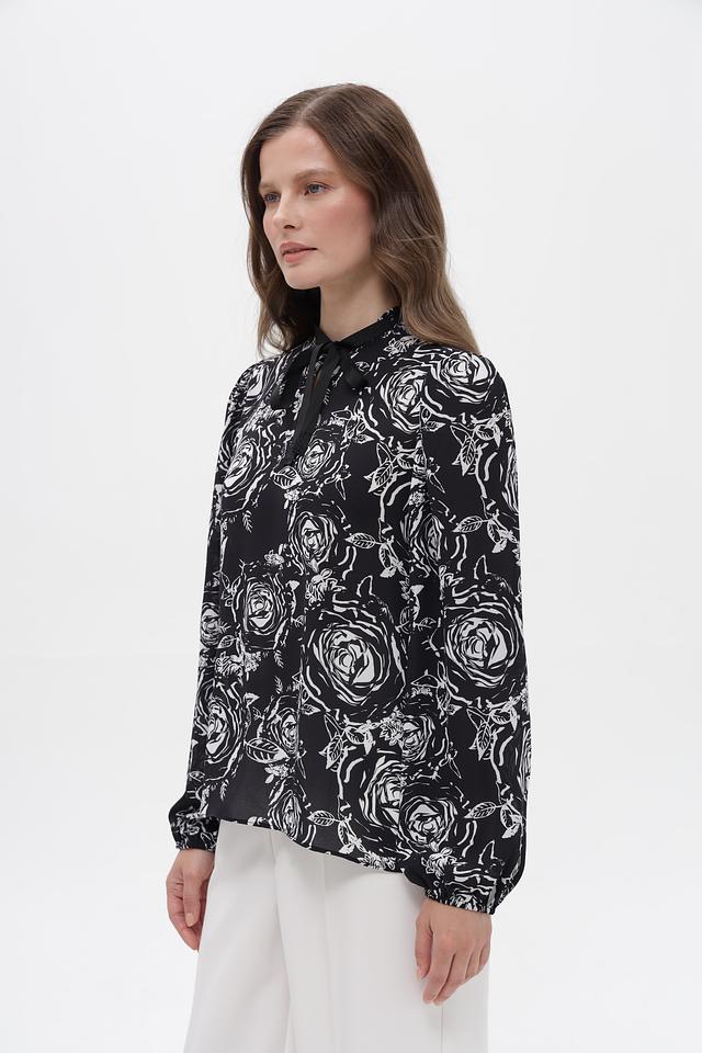 Модель имеет длинные рукава и высокий воротник с завязками, которые можно повязать различными способами, создавая разные образы. Блузка выполнена из высококачественного полиэстера, который приятен к телу и не требует сложного ухода.