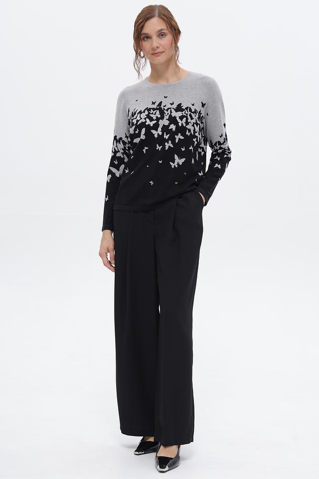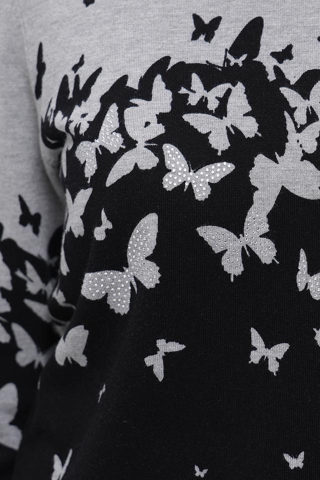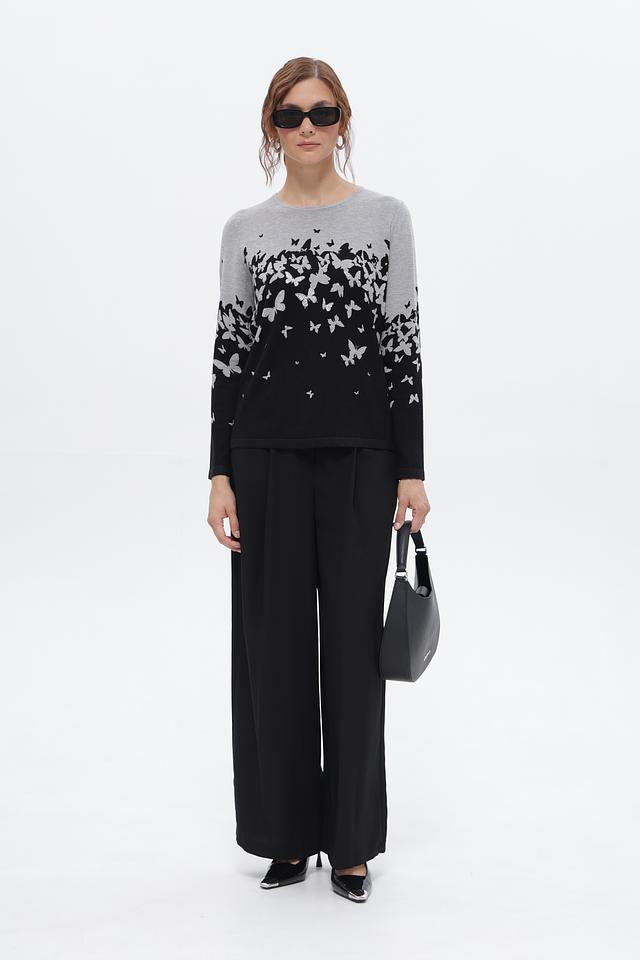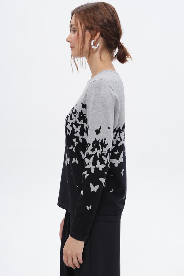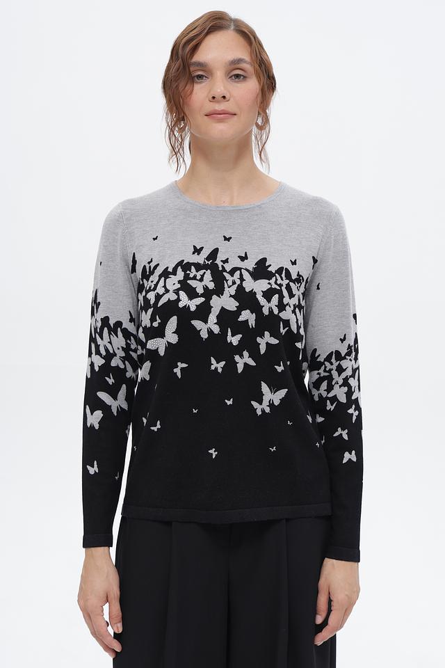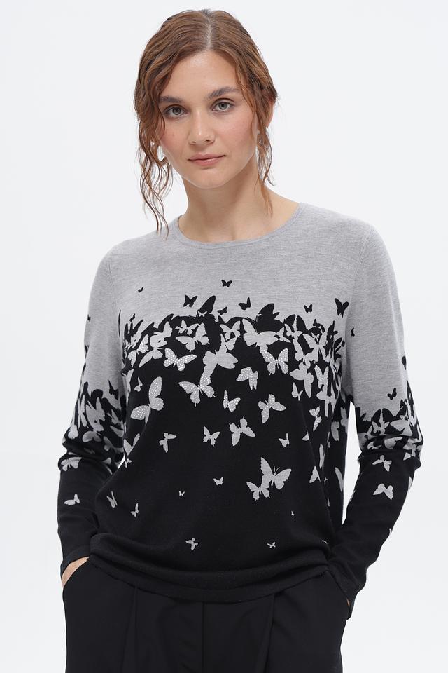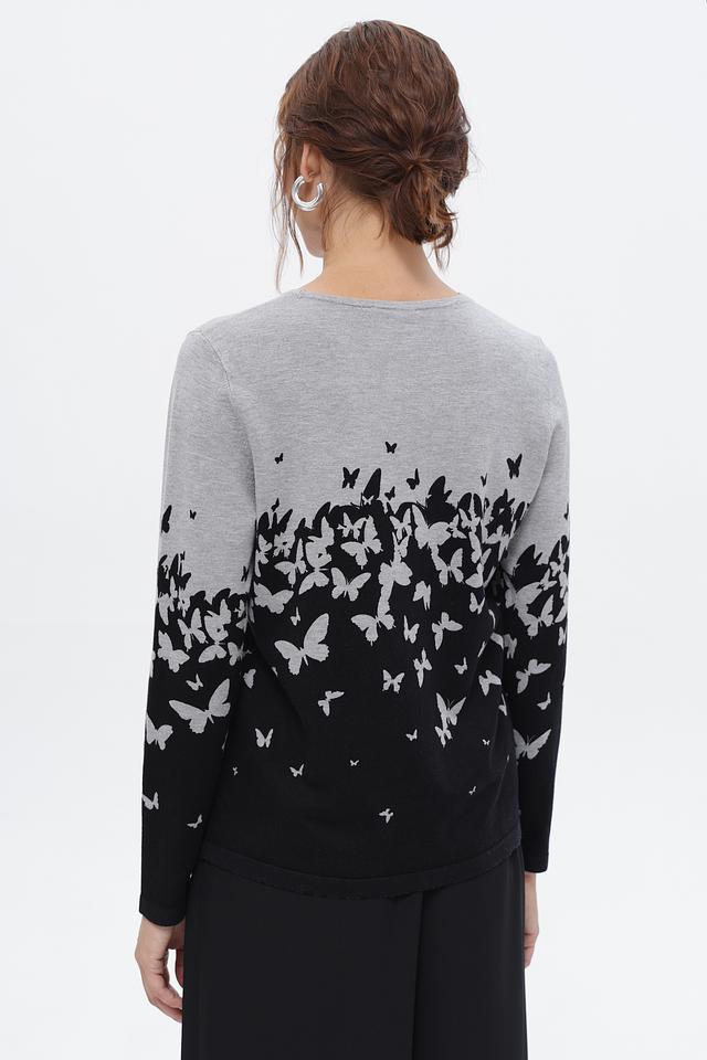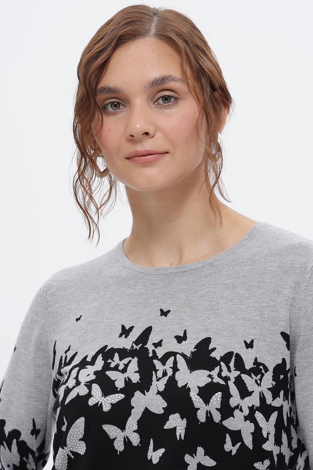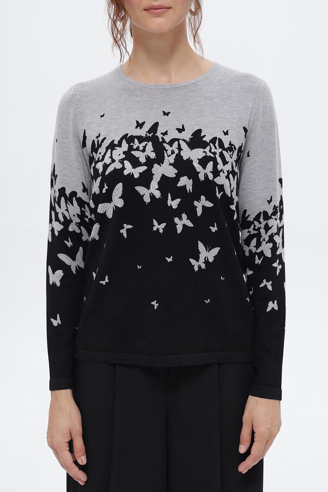Элегантный пуловер от бренда Just Valeri станет отличным дополнением к вашему гардеробу. Модель выполнена в сером цвете, а нижняя часть украшена принтом с изображением бабочек.