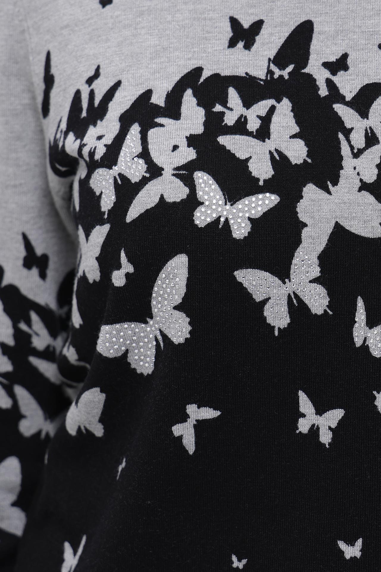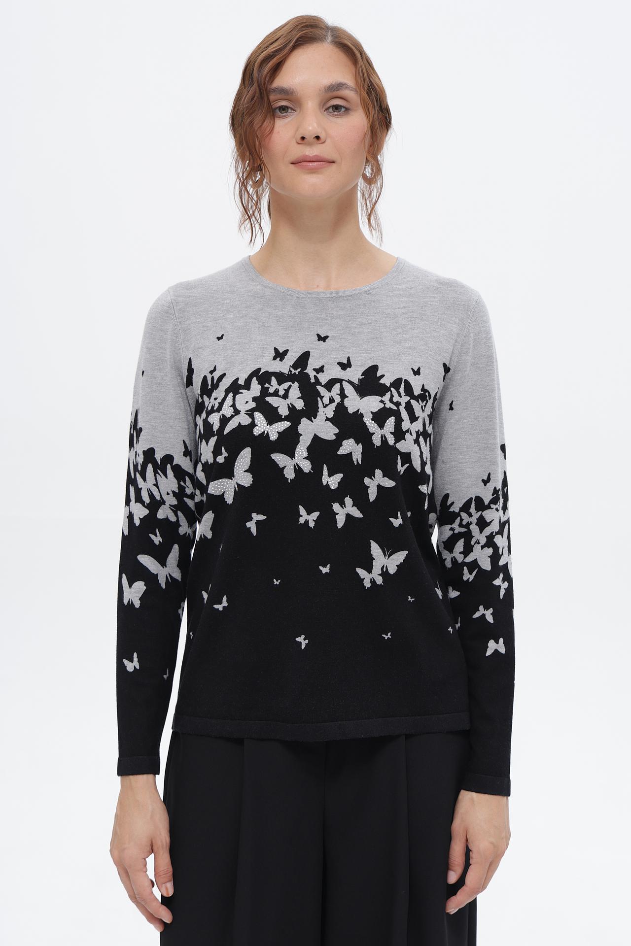Элегантный пуловер от Just Valeri станет изысканным дополнением вашего гардероба. Модель выполнена в градиентных оттенках серого и черного, украшена эффектным принтом в виде множества порхающих бабочек, некоторые из которых декорированы мельчайшими кристаллами, добавляющими деликатное мерцание. Этот пуловер идеально подойдет для создания утонченных и женственных образов.
