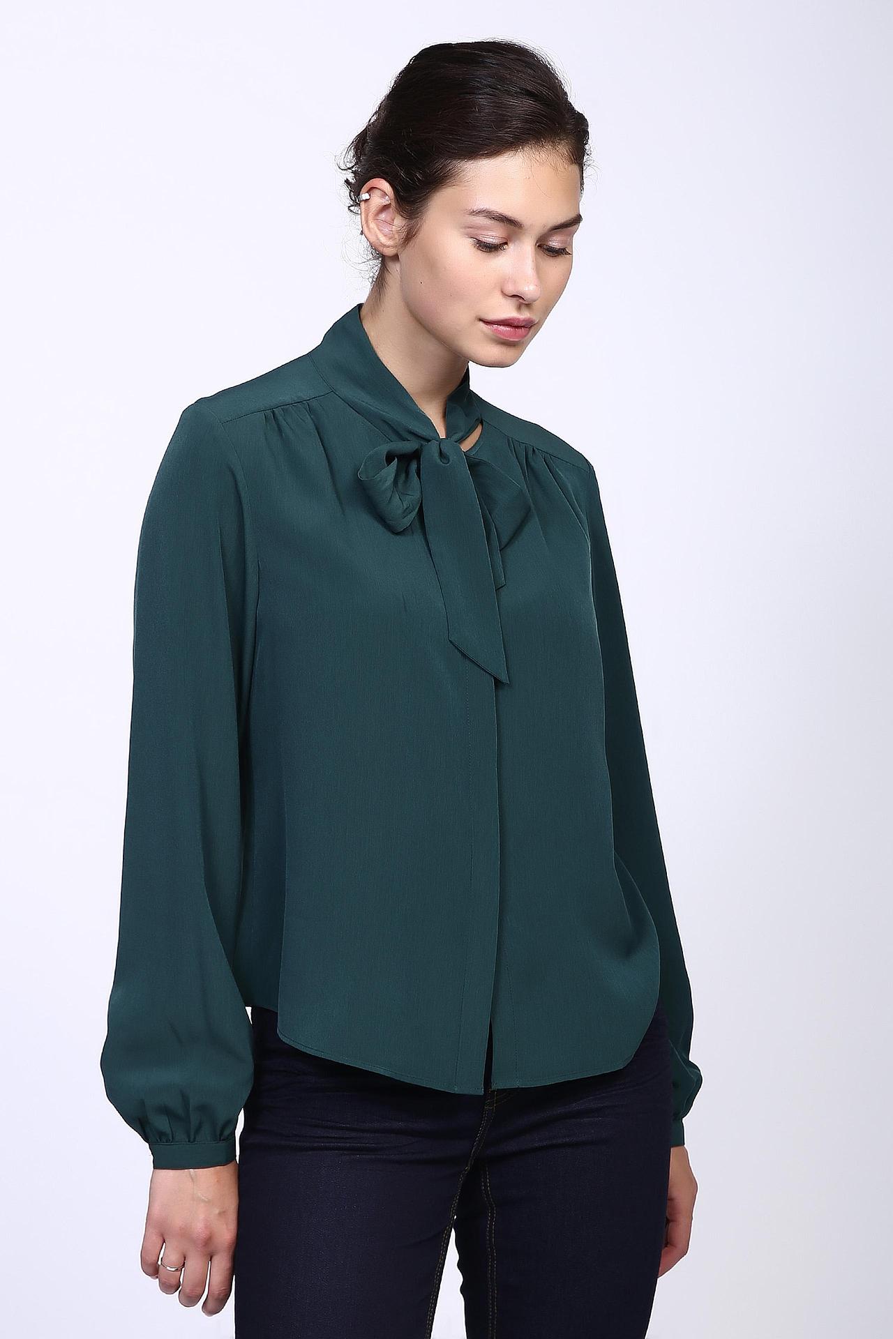 - Дизайн: Блуза имеет классический воротник-стойку с декоративным бантом, который придает образу особую женственность и шик. Длинные рукава с манжетами на пуговицах и аккуратные складки на спине дополняют элегантный силуэт.