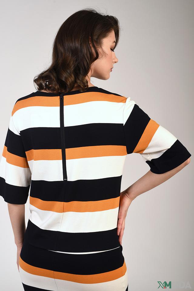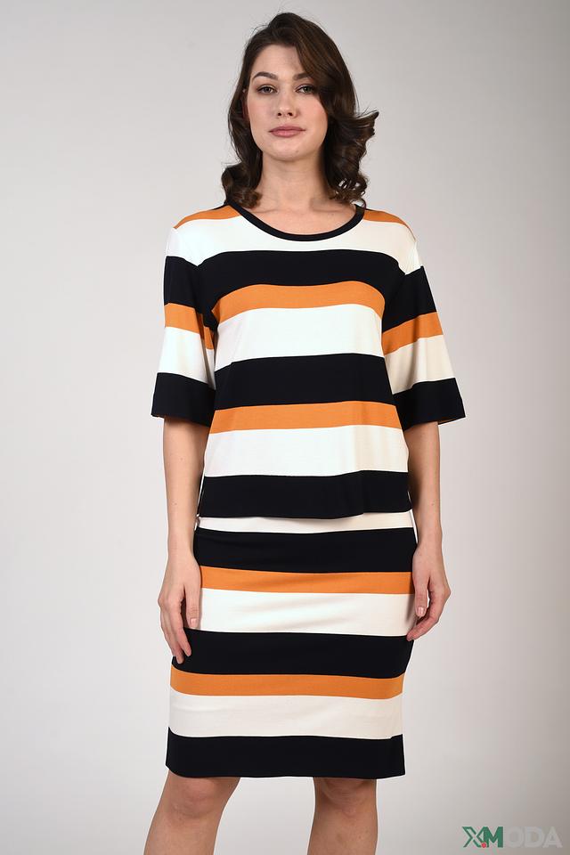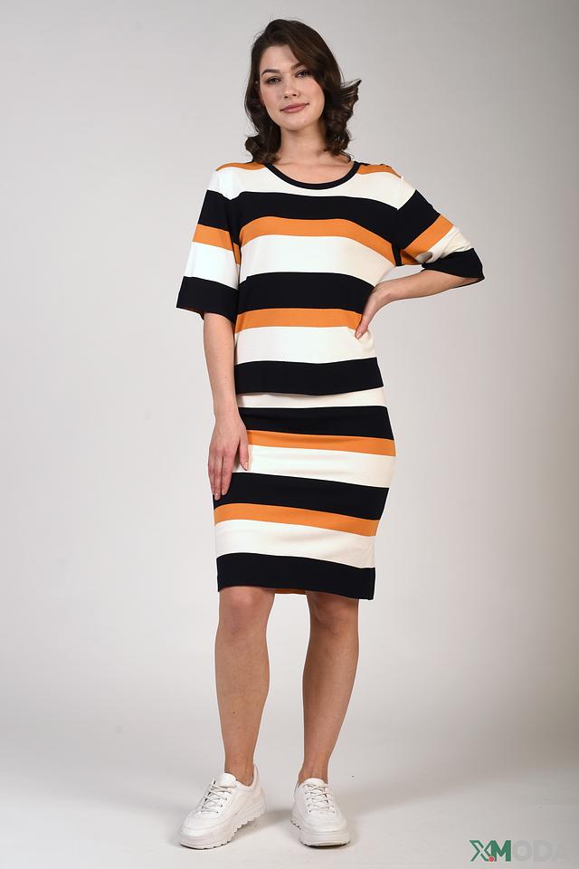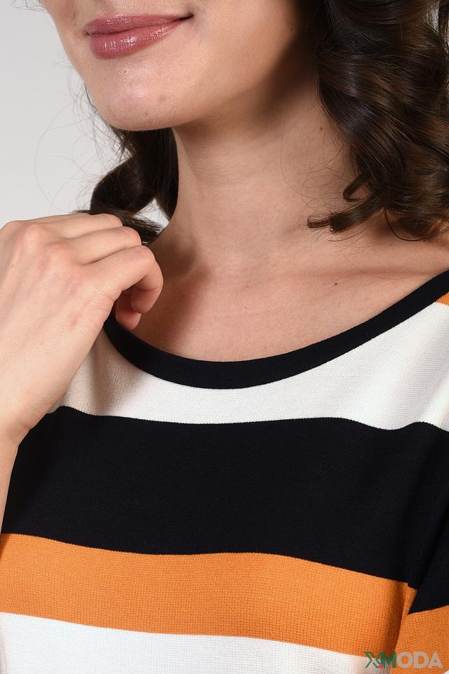 Это платье от бренда Just Valeri – отличный выбор для создания повседневного образа. Модель выполнена в горизонтальную полоску, сочетающую в себе чёрный, оранжевый и белый цвета.