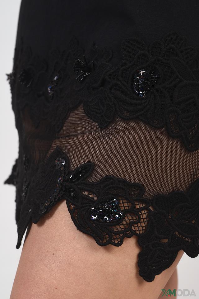 Особенностью данной модели является кружевной декор по низу изделия. Кружево выполнено в чёрном цвете с добавлением мелких блестящих элементов, что придает платью изысканность и привлекательность.