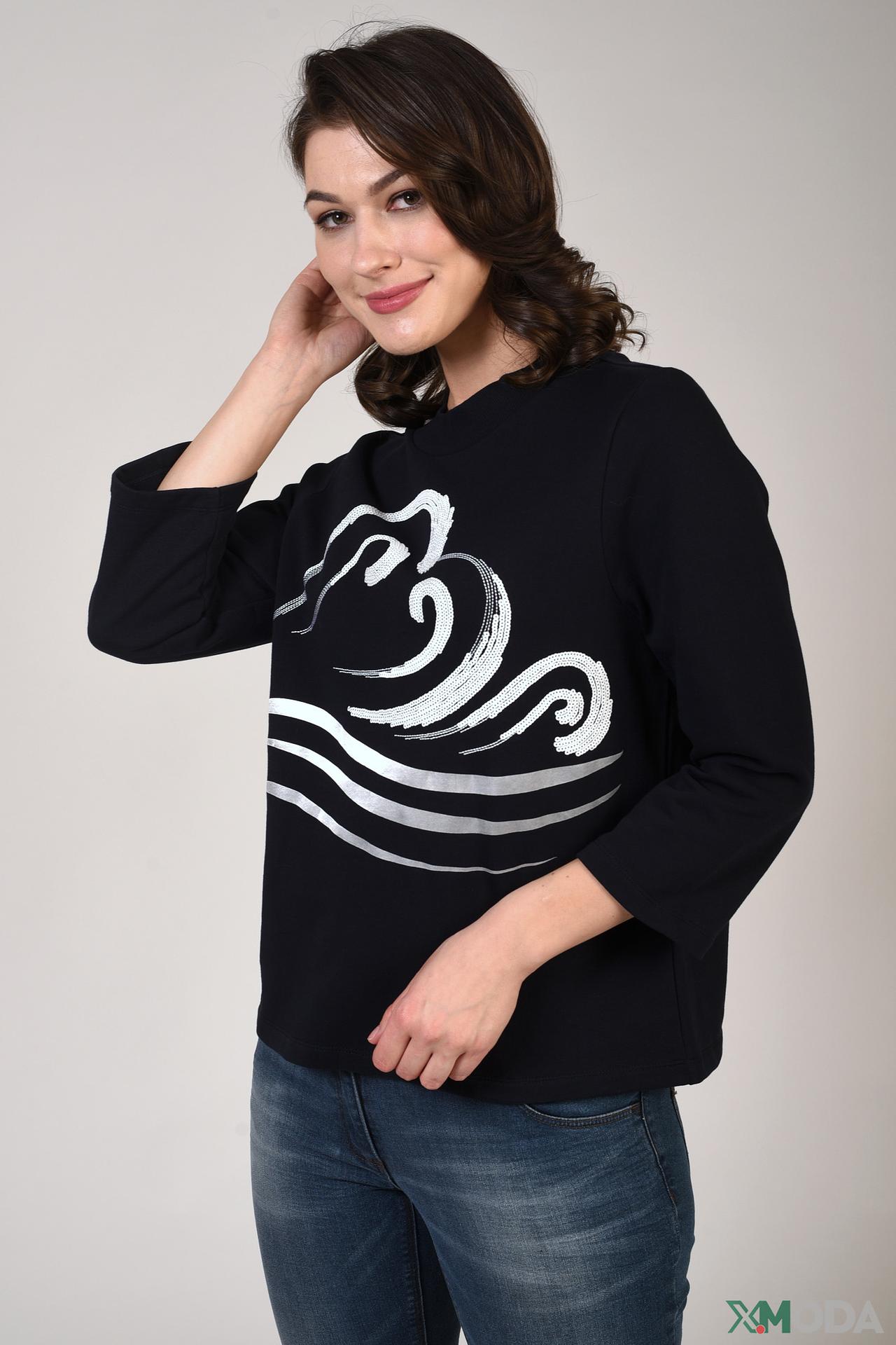 - Дизайн: Классический крой с рукавами ¾ и круглым вырезом горловины. Принт с пайетками делает модель уникальной и запоминающейся.