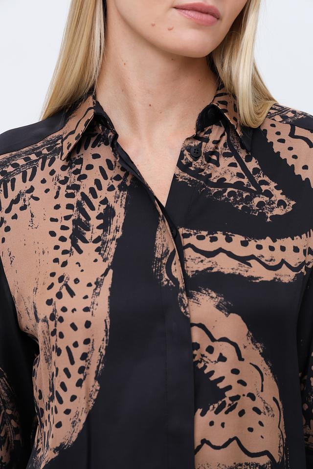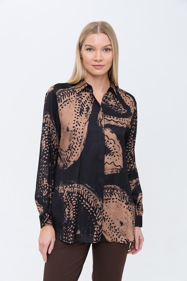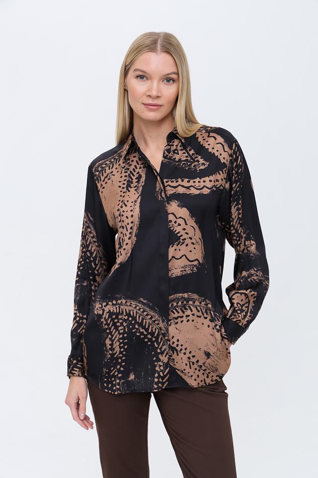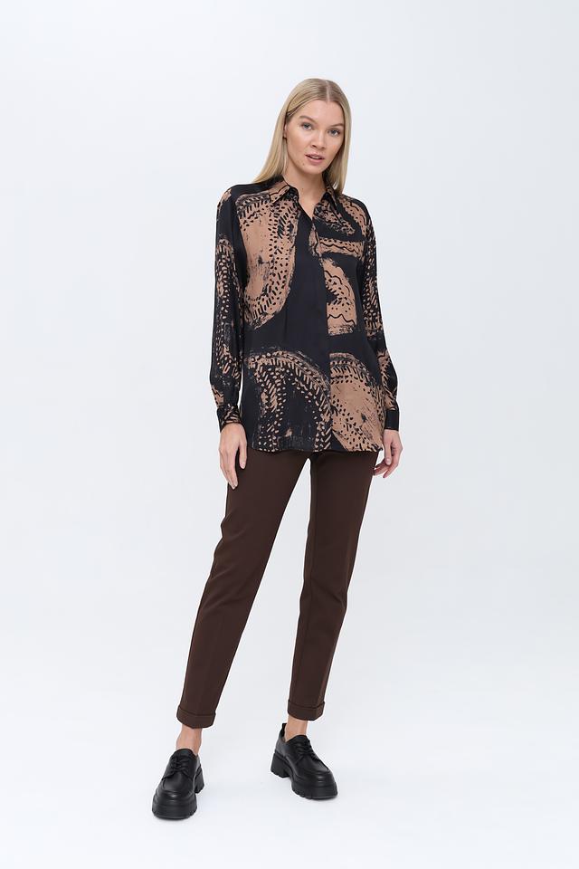Блуза имеет свободный крой, длинные рукава и классический отложной воротник. Застёжка на пуговицах позволяет регулировать степень открытости. Привлекает внимание оригинальный принт, сочетающий в себе абстрактные мотивы в бежево-коричневой гамме на чёрном фоне.