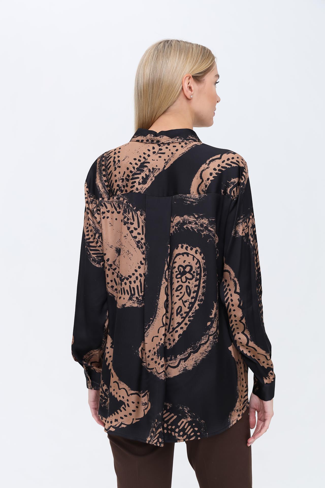 - Дизайн: Классический крой с воротником и длинными рукавами дополнен ярким абстрактным принтом. Детализация узора создает глубину и динамику, делая эту блузу настоящим акцентом в любом наряде.