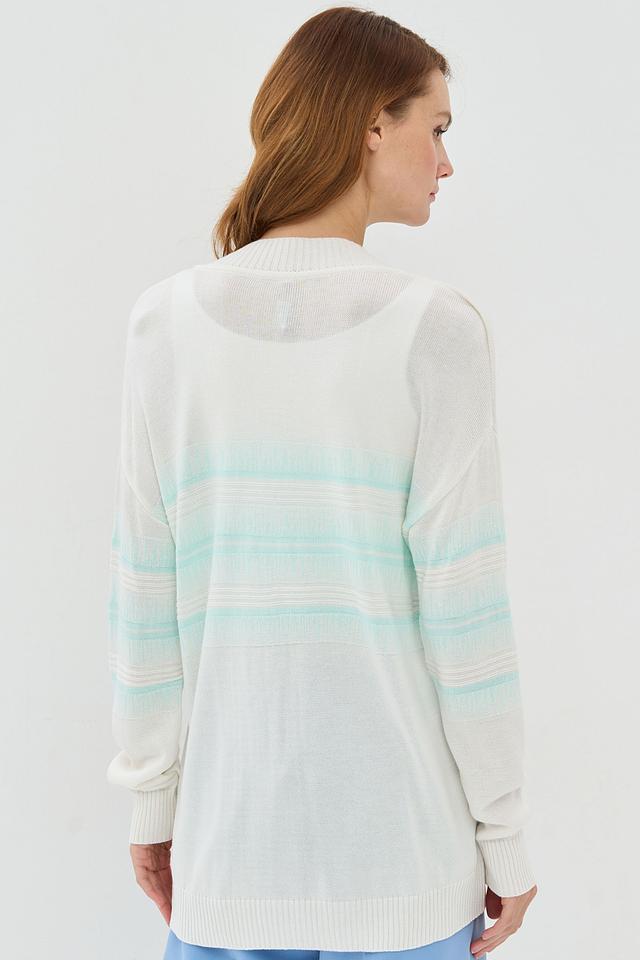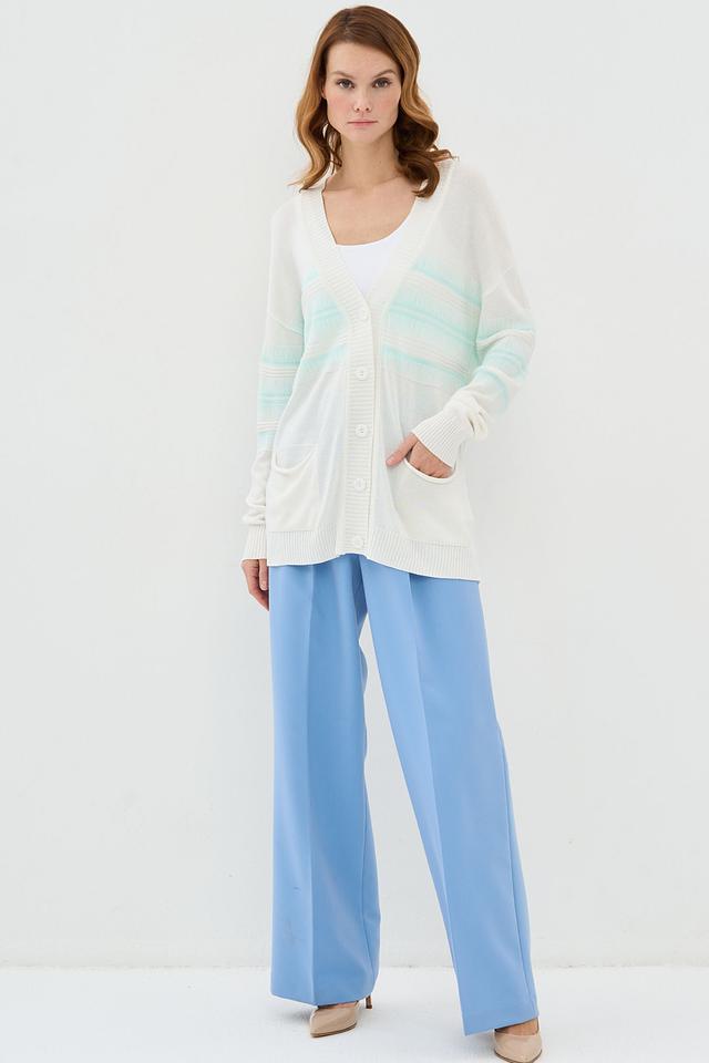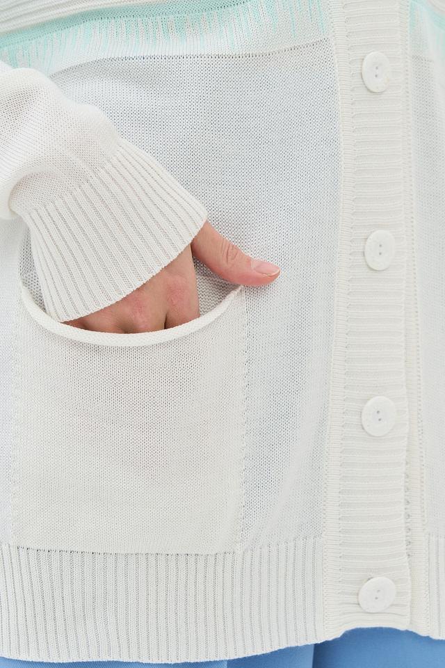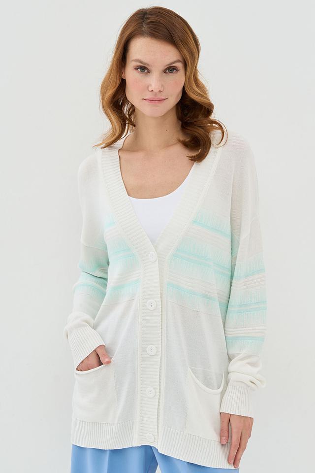 Этот стильный кардиган от BE YOU выполнен в нежном кремовом цвете с добавлением светло-голубых полос. Модель имеет свободный крой, который обеспечивает комфорт в носке, и V-образный вырез, который визуально удлиняет шею.