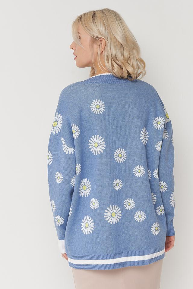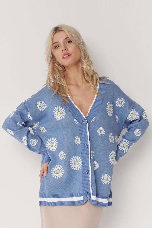 Представляем вашему вниманию стильный кардиган от бренда BE YOU. Эта модель выполнена в нежном голубом цвете и украшена очаровательным узором из ромашек, что придает ей романтичный и женственный вид.