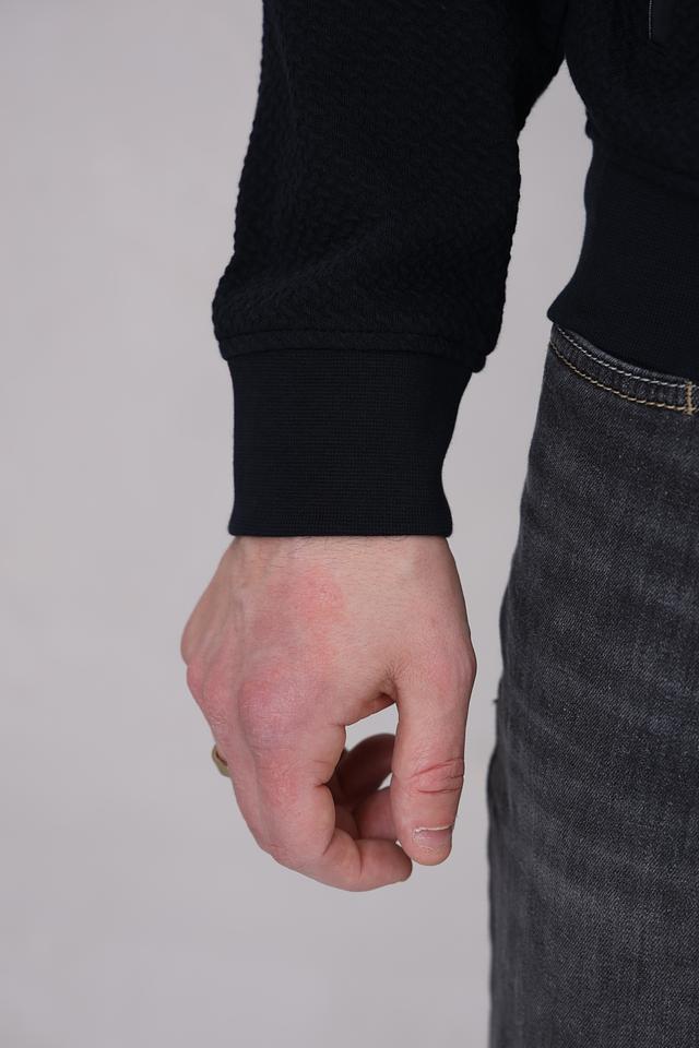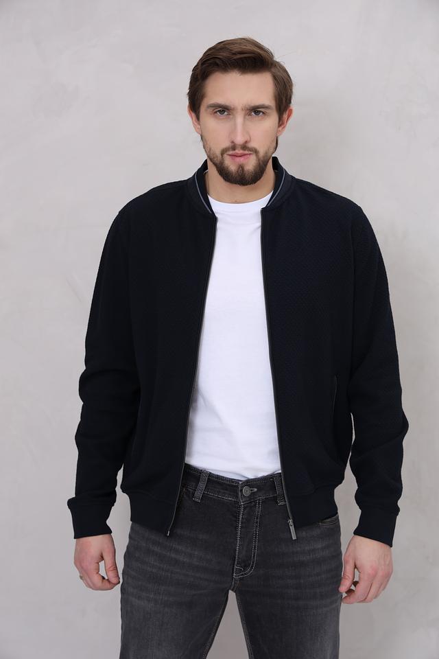 Кардиган имеет удобную застёжку на молнии, воротник-стойку с контрастной полосой и манжеты в рубчик. Текстура ткани с мелким геометрическим рисунком придает изделию особый шарм.