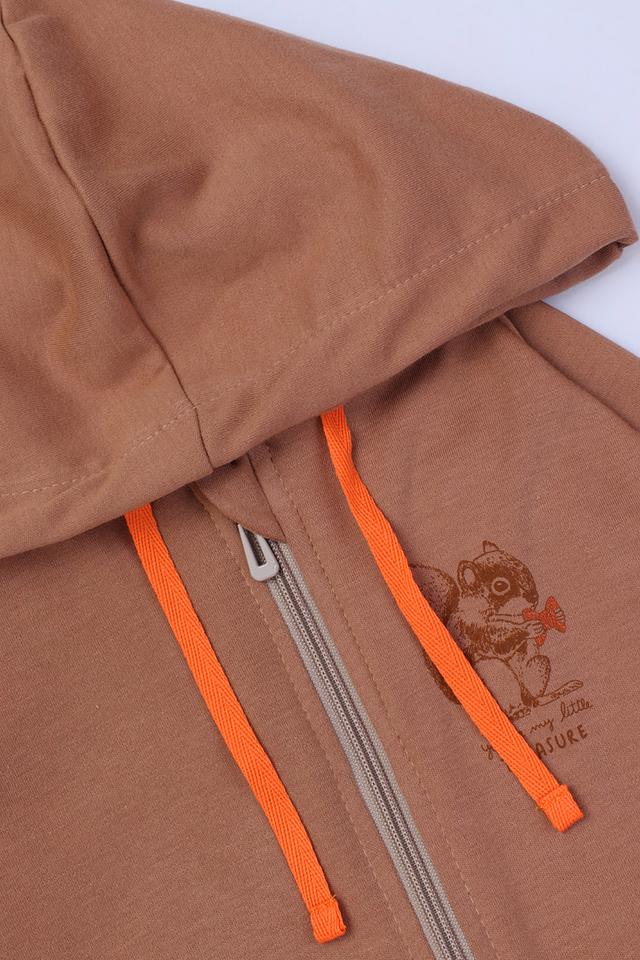Кардиган имеет капюшон, который защитит от ветра и дождя. На груди расположена очаровательная аппликация с изображением зверушки, что придает изделию игривый и привлекательный вид. Яркие оранжевые шнурки капюшона добавляют акцент и индивидуальность.