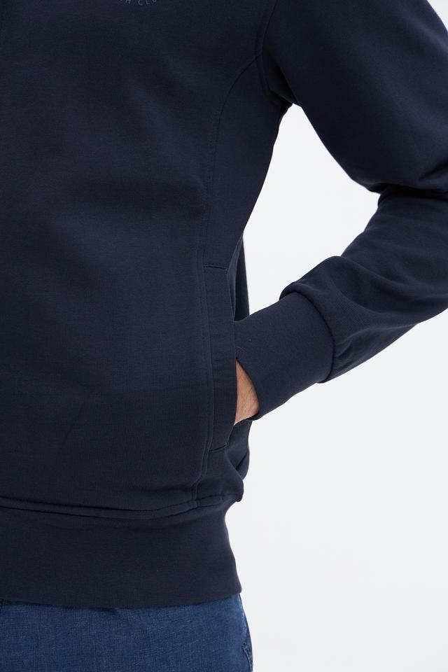 Кардиган имеет классический крой с застежкой-молнией, что позволяет легко регулировать степень тепла. Тёмно-синий цвет делает его универсальным дополнением к любому образу, легко сочетается с джинсами, брюками и футболками.