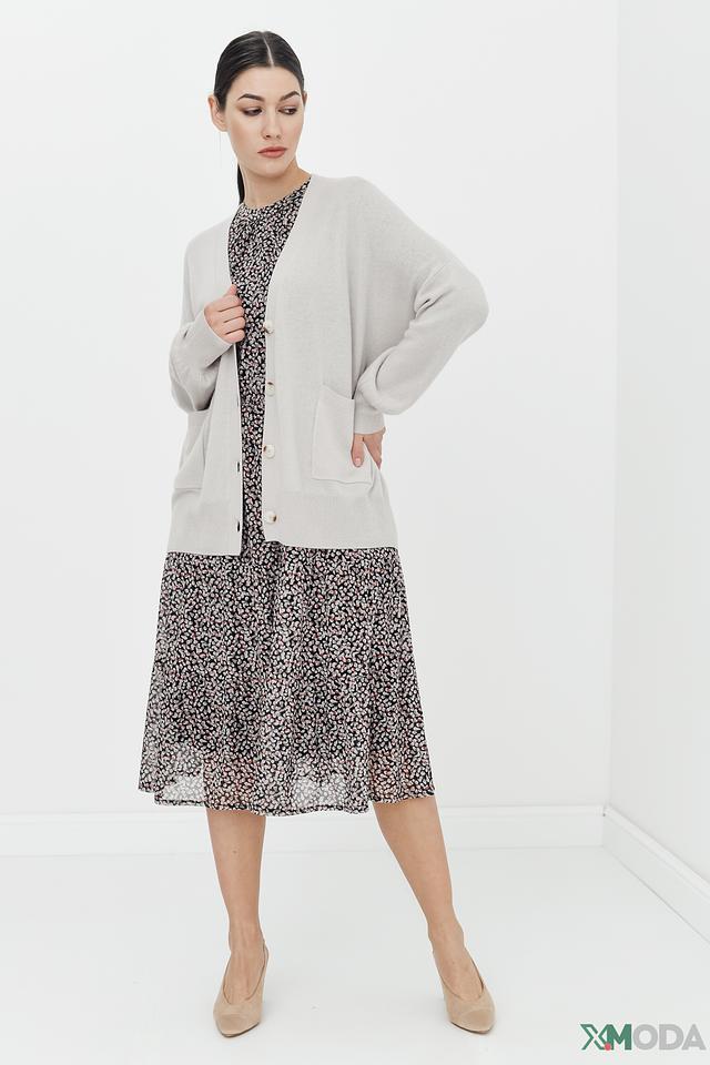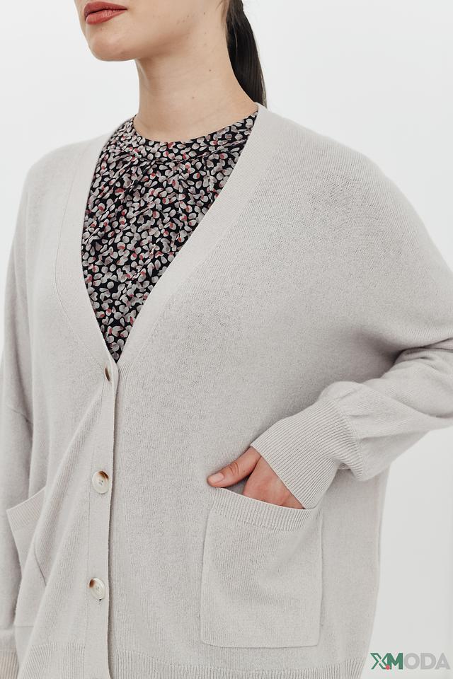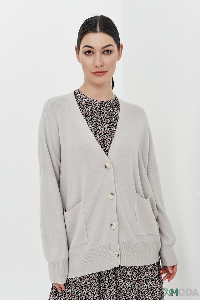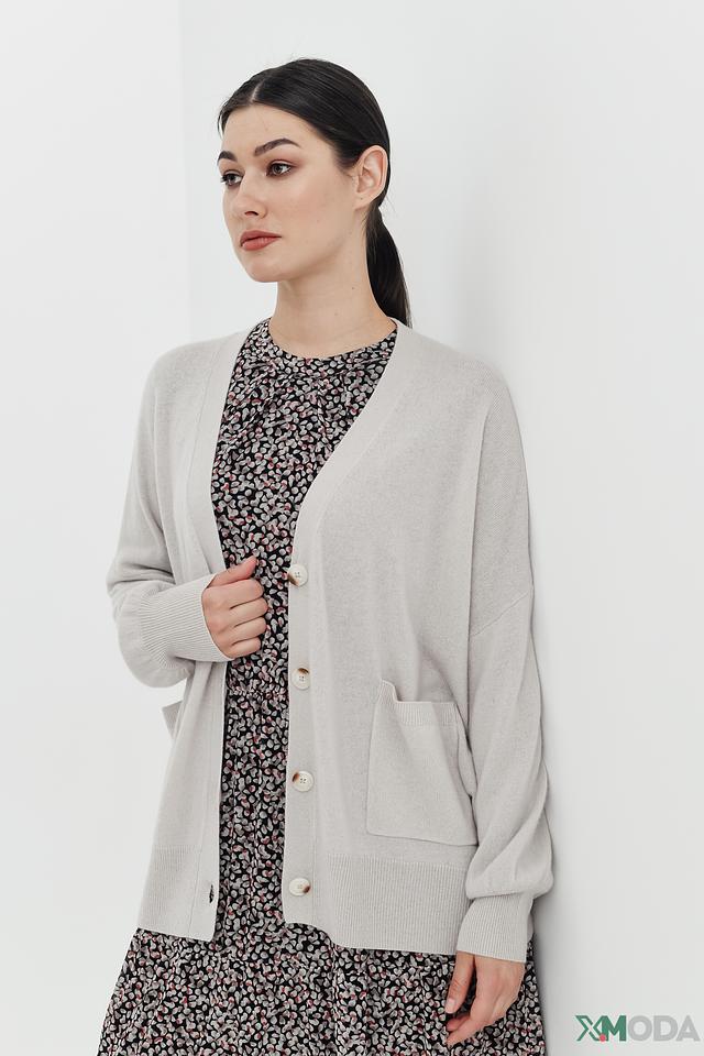Модель имеет свободный крой, V-образный вырез и застегивается на пуговицы. Кардиган оснащен двумя удобными карманами. Длинные рукава с манжетами обеспечивают дополнительный комфорт.
