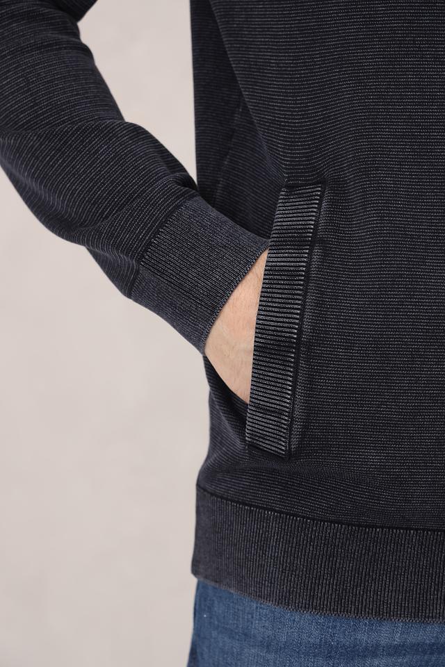 Кардиган изготовлен из высококачественного хлопка, что обеспечивает мягкость, комфорт и воздухопроницаемость. Текстурированная вязка придает изделию интересный вид. На плечах и локтях имеются вставки из гладкой ткани контрастного серого оттенка.