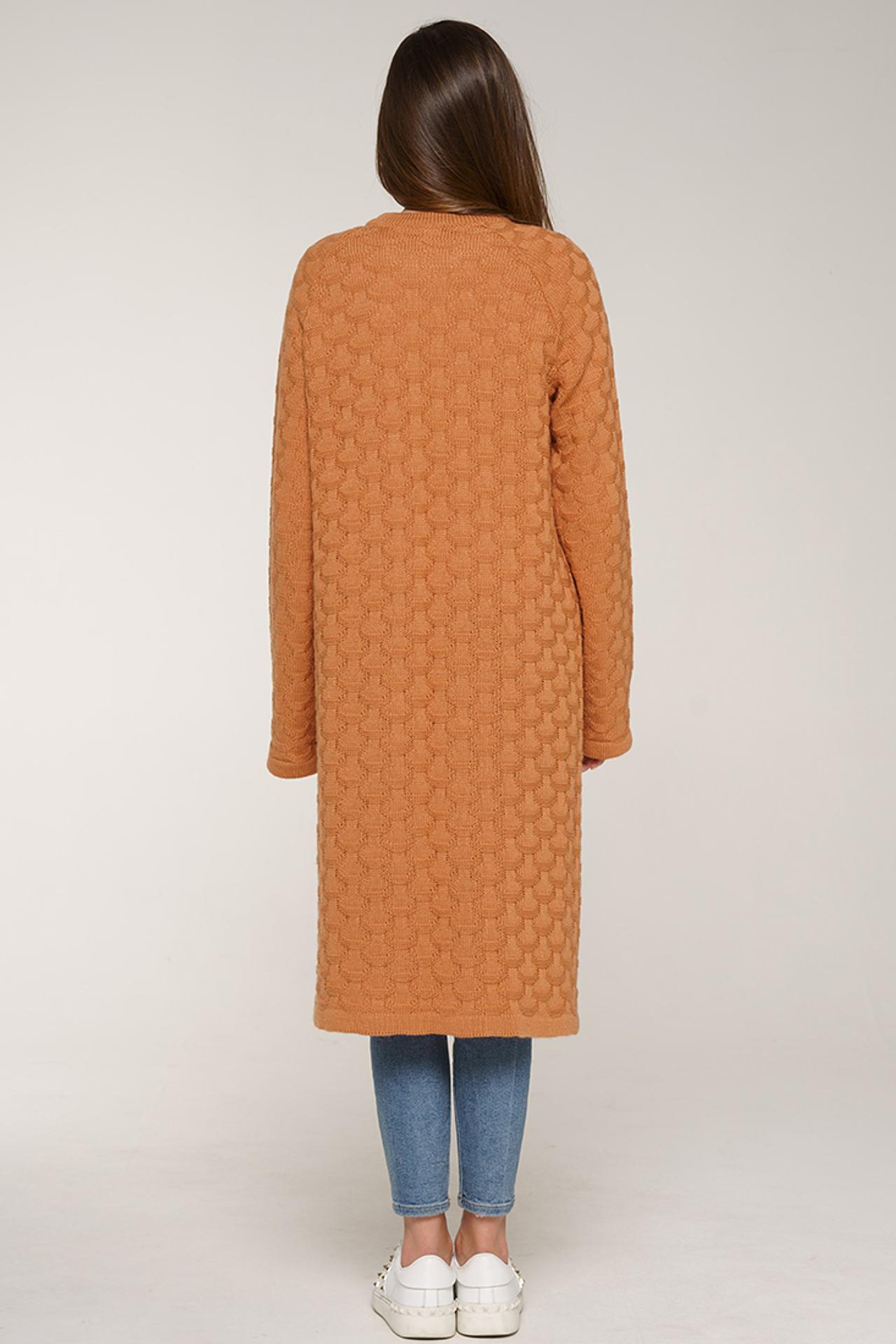 Длинный крой визуально вытягивает силуэт, делая фигуру более стройной. Застежка на одну пуговицу добавляет кардигану изысканности и позволяет носить его как в застегнутом, так и в распахнутом виде. Фактурная вязка придает изделию неповторимый шарм. Этот кардиган станет отличным дополнением к вашему повседневному или деловому гардеробу.