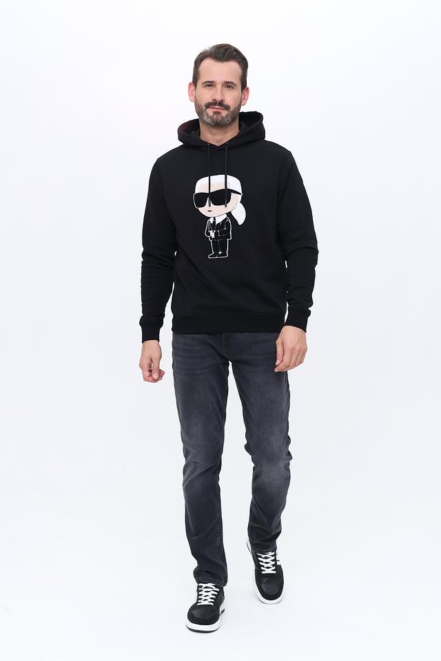 Мужская толстовка Karl Lagerfeld чёрного цвета с оригинальным принтом в виде портрета дизайнера. Модель выполнена из мягкого и приятного к телу хлопка, обеспечивающего комфорт в повседневной носке. Состав: хлопок 100%