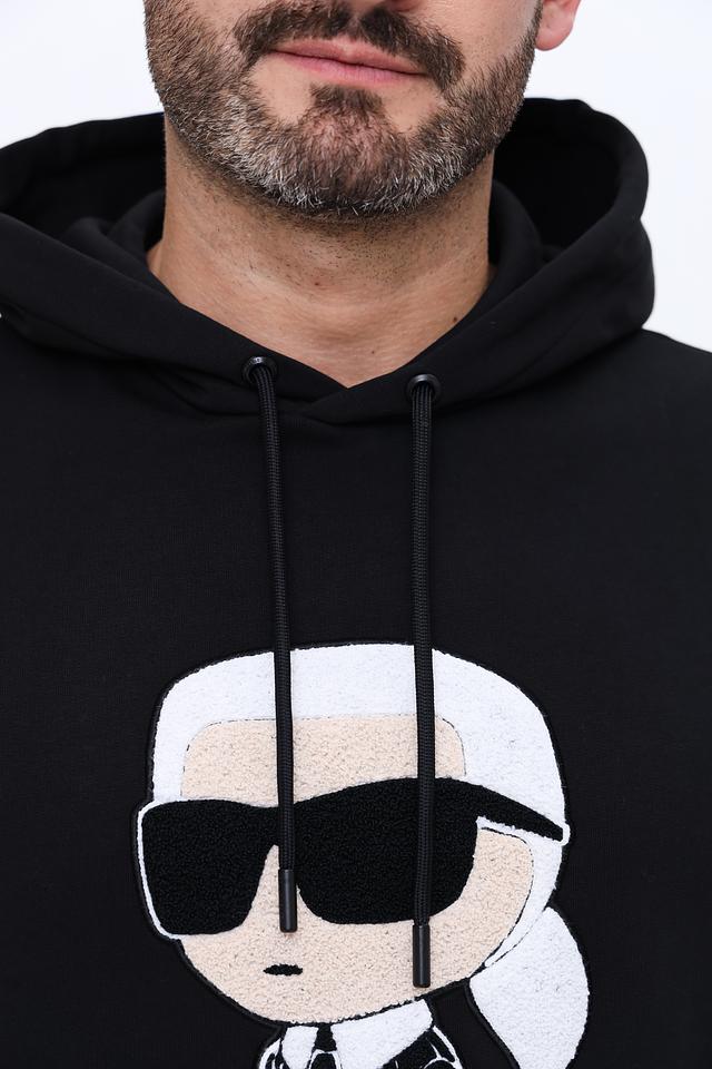 Основным акцентом толстовки является яркий принт на лицевой стороне, изображающий узнаваемый портрет Карла Лагерфельда в его фирменном стиле – в тёмных очках и строгом костюме. Принт выполнен в контрастных чёрно-белых тонах, что делает его особенно заметным.